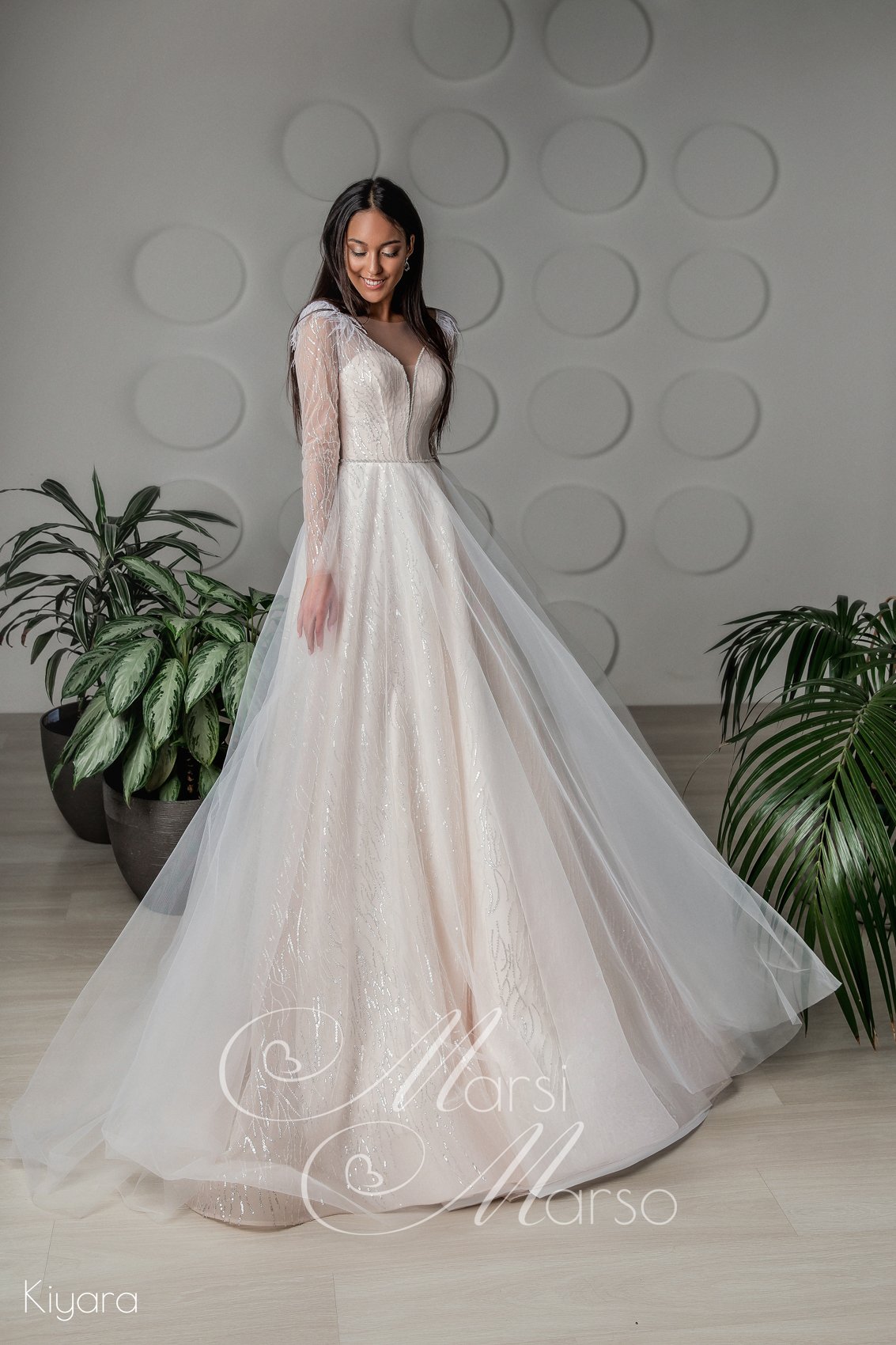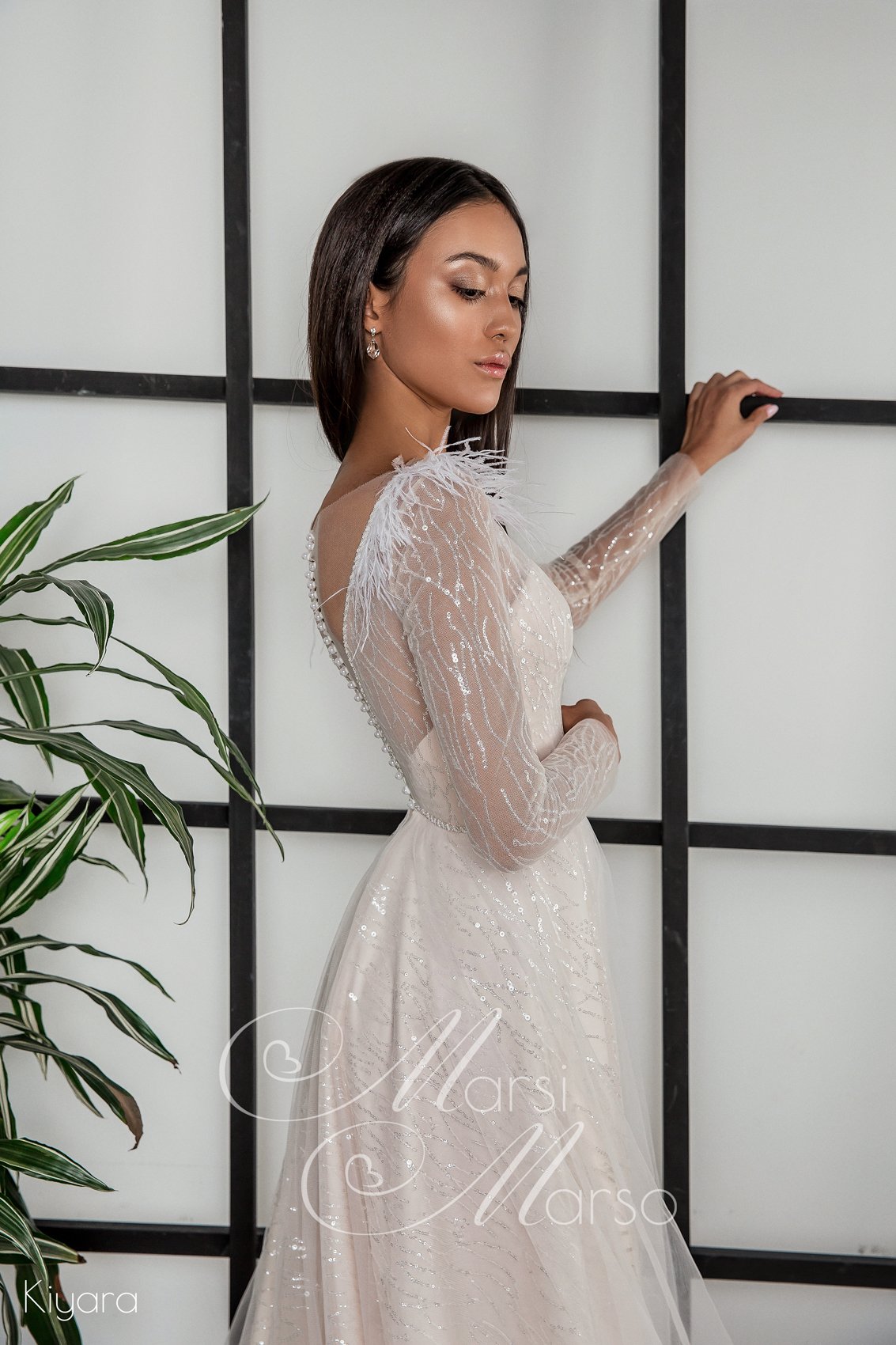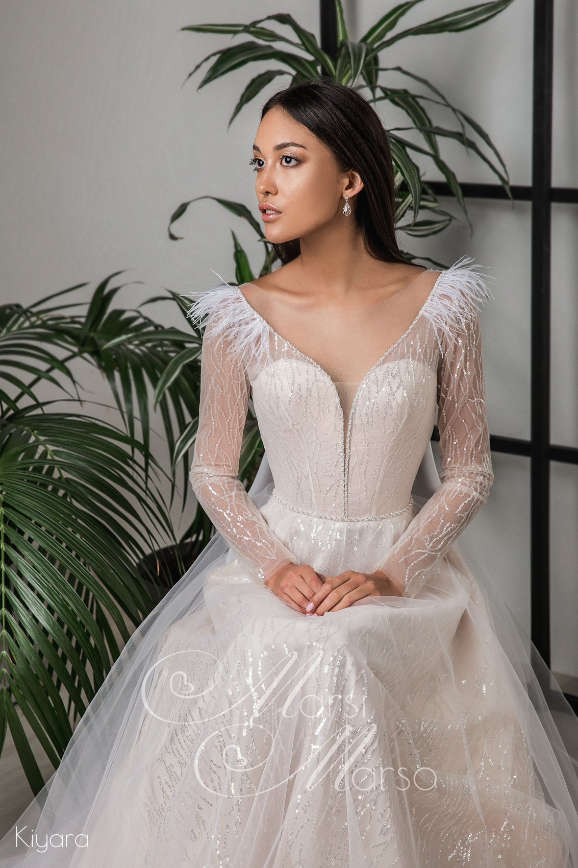 Kiyra - платье, которое отличается безупречностью стиля. И пышная юбка, и мерцание ткани, и трепетные перышки - все эти заманчивые модные акценты пленяют невест с первого взгляда!