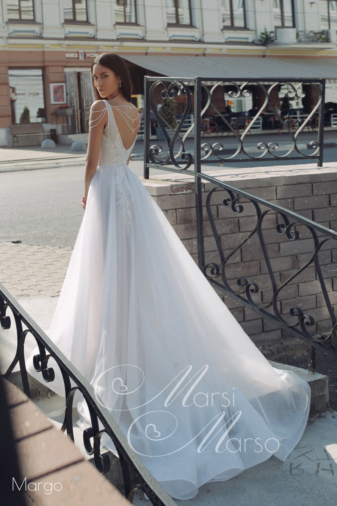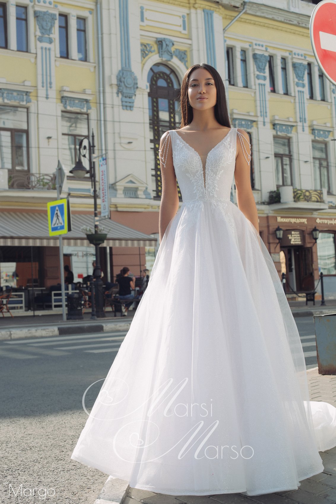 Невеста хочет платье как с обложки журнала? Margo - тот самый вариант, идеальный и безупречный. Стопроцентный хит, который не обходят вниманием самые разные невесты, и это не случайно! Радуют силуэт и посадка, мерцание глиттера, расшитое кружево и соблазнительные жемчужные бусики.