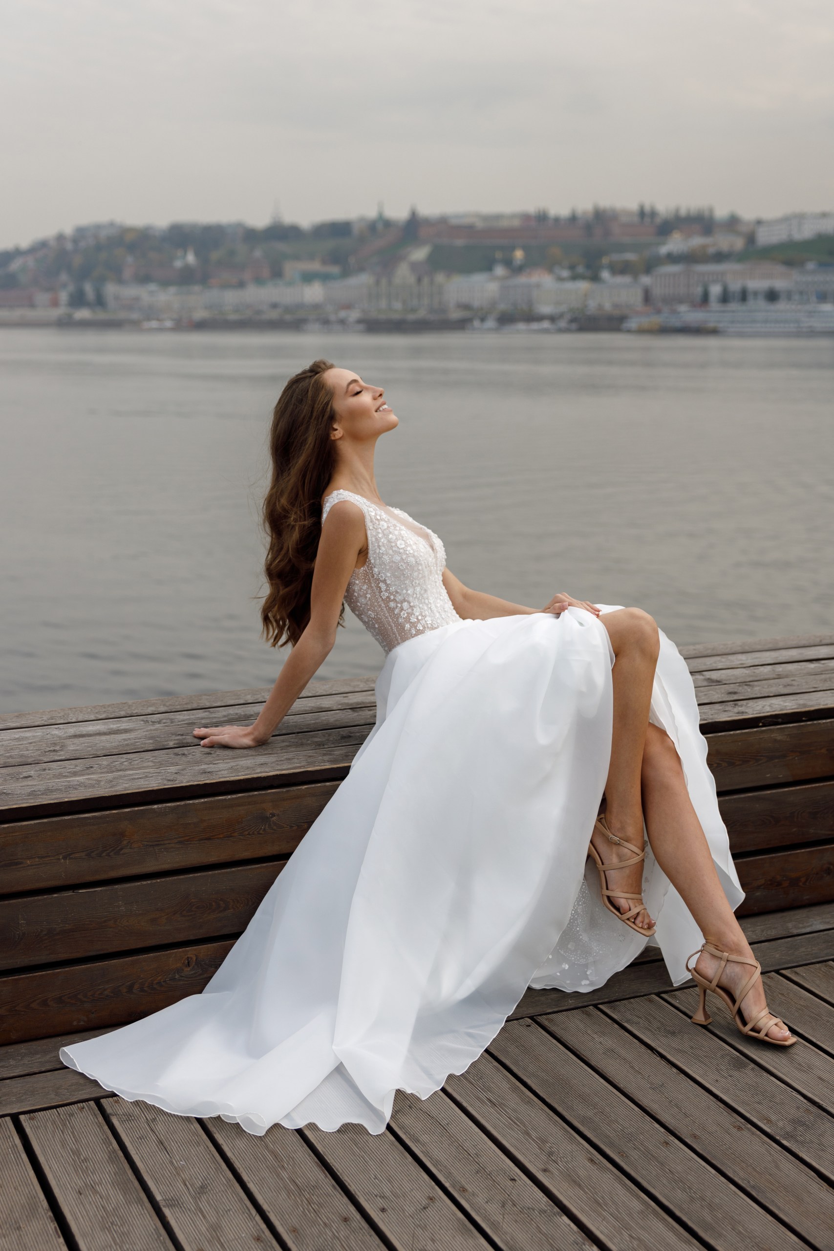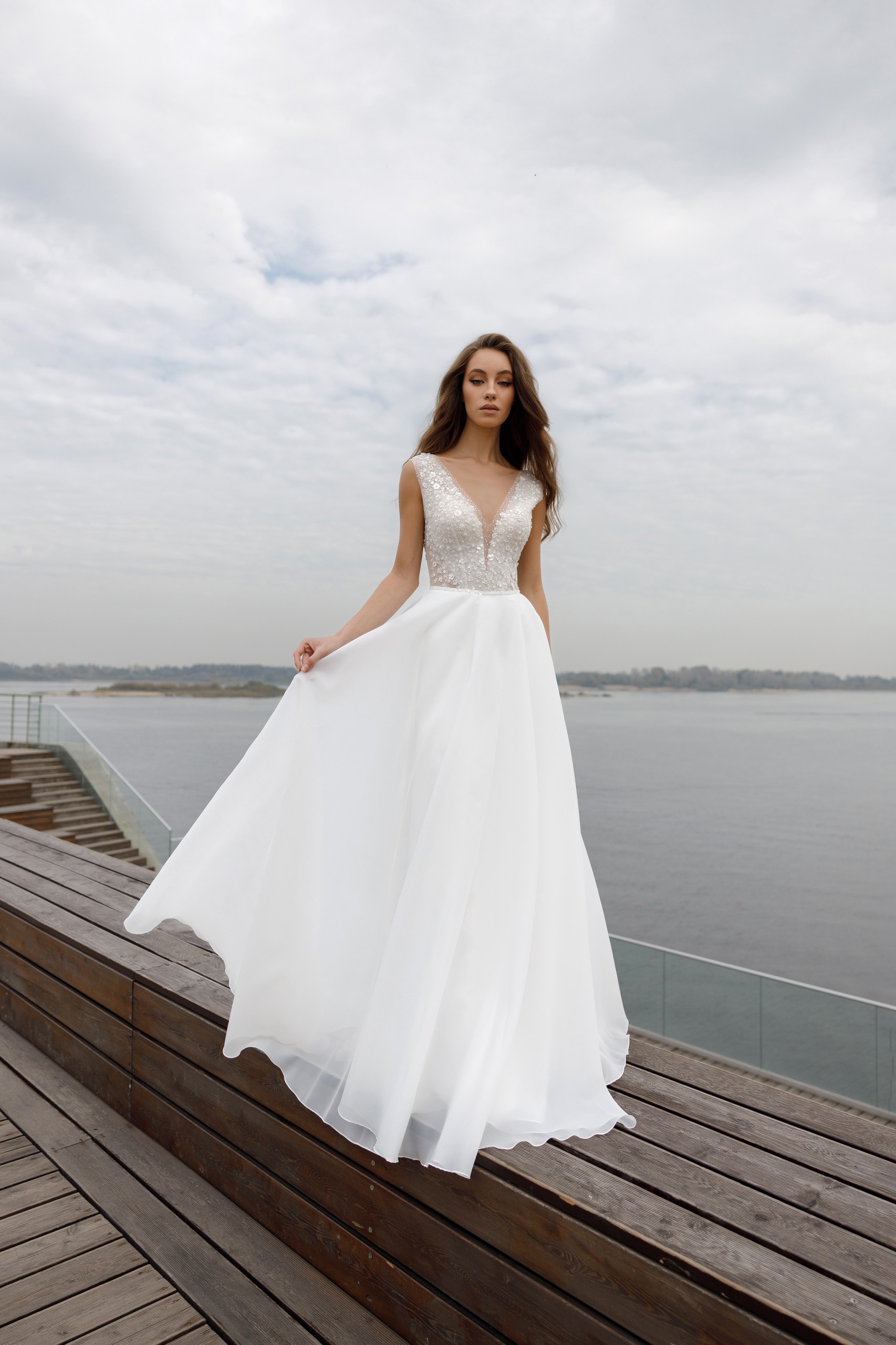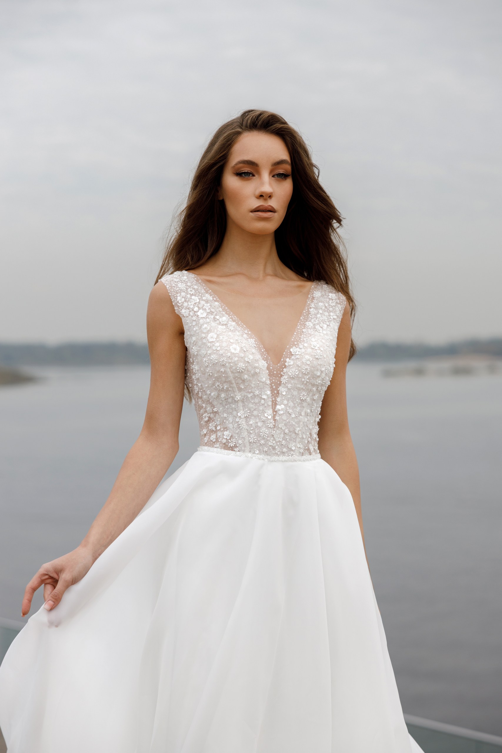 Легкое свадебное платье с юбкой из органзы. Топ выполнен из кружева полностью расшитого изящными цветочками из бисера и матовых молочных пайеток. Акцентные полупрозрачные бочка на топе делают талию стройнее. Платье можно дополнить рукавами и 3д декором, как на платье Afrodita.