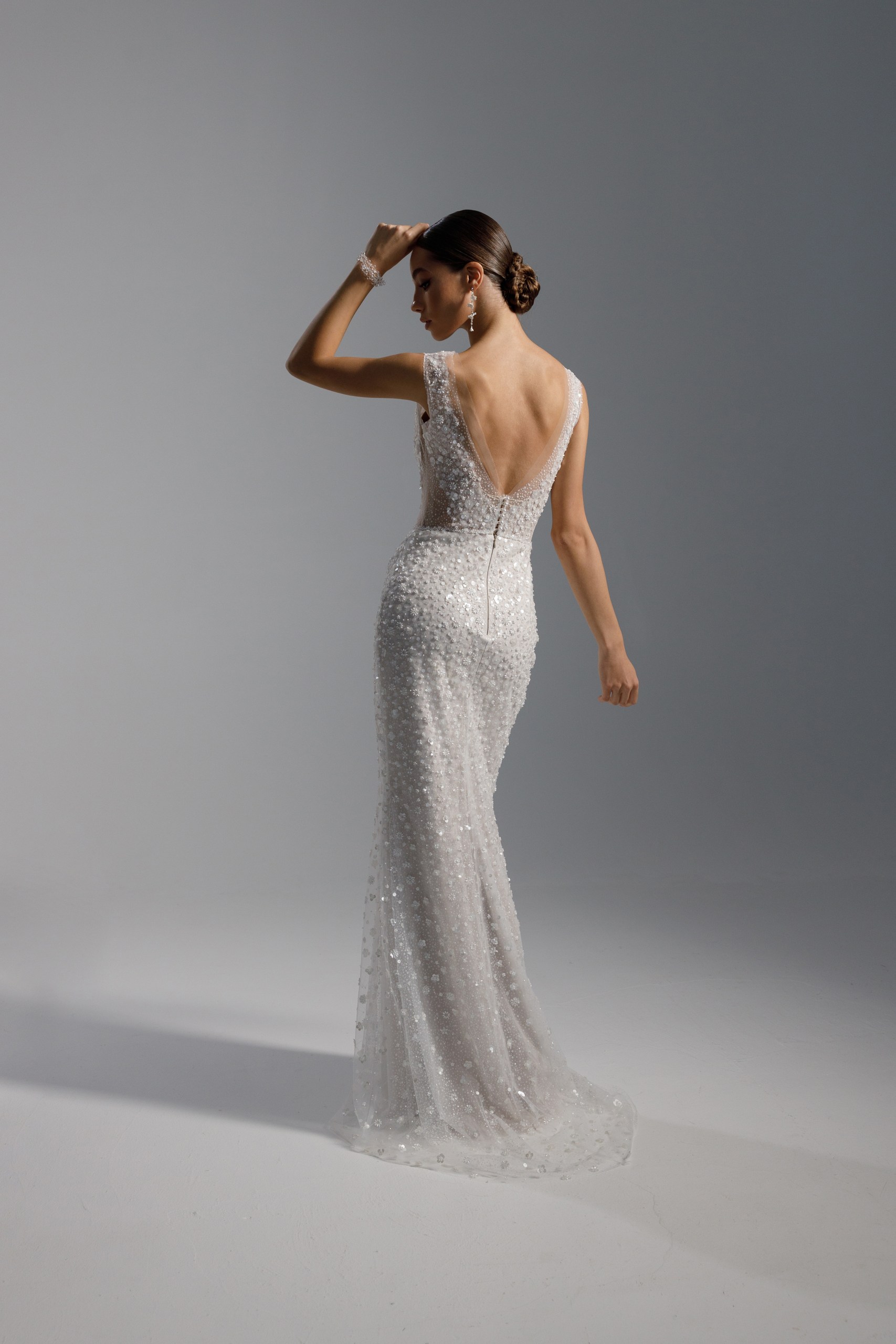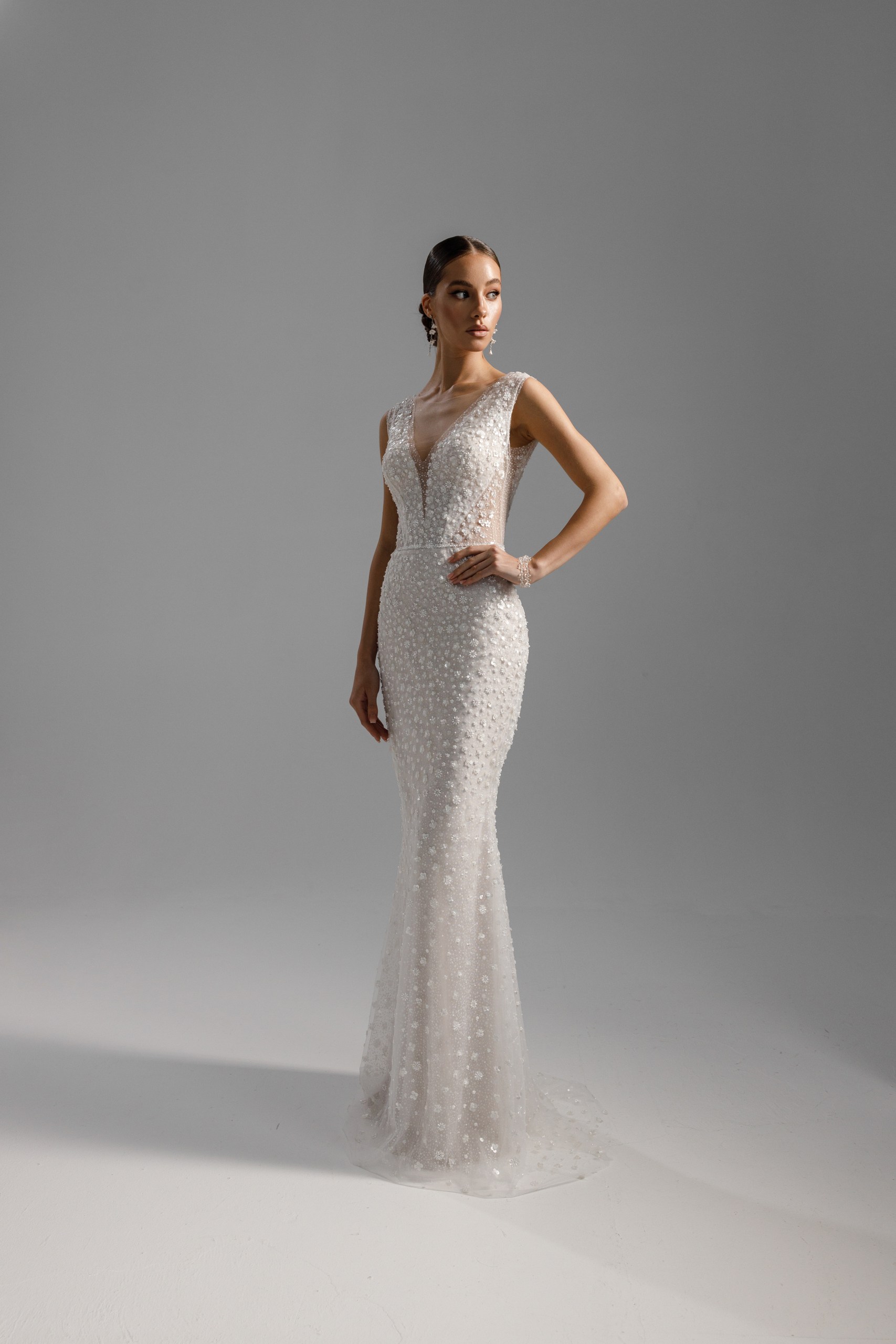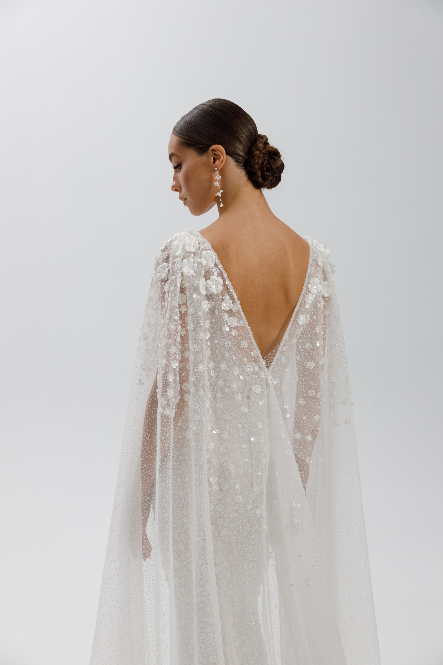 Premium. Силуэтное свадебное платье выполнено из необыкновенной красоты кружева усыпанного бисерными цветочками на слое фатина с глиттером «снег». Лиф на внутреннем корсете имеет акцентные приоткрытые бочка, что визуально делает талию тонкой. Комфортная юбка на трикотажной основе. Ульрамодный мерцающий кейп с 3д декором создает интригующий образ. Также платье удачно будет сочетаться со съемной юбкой Afrodita
