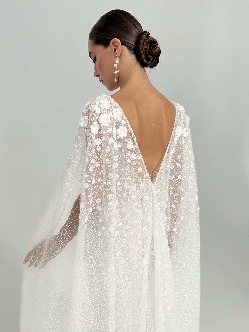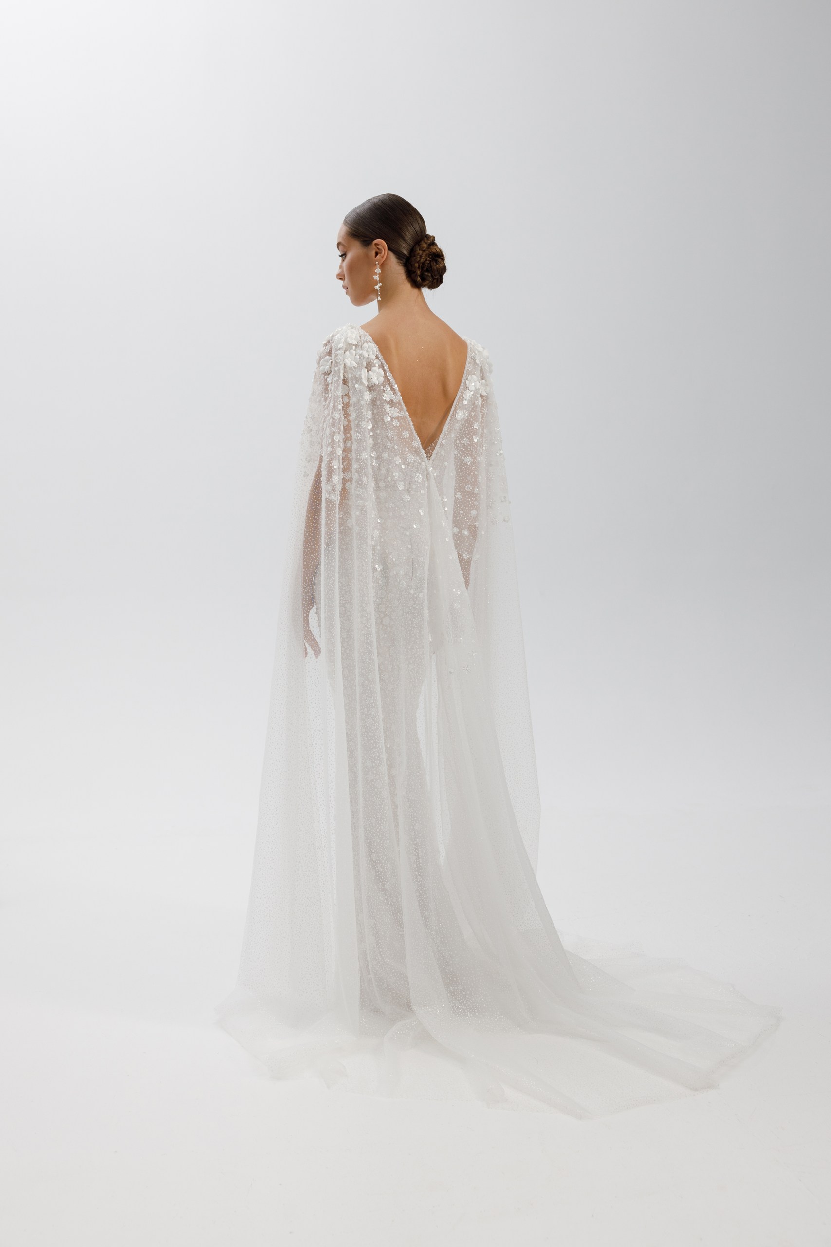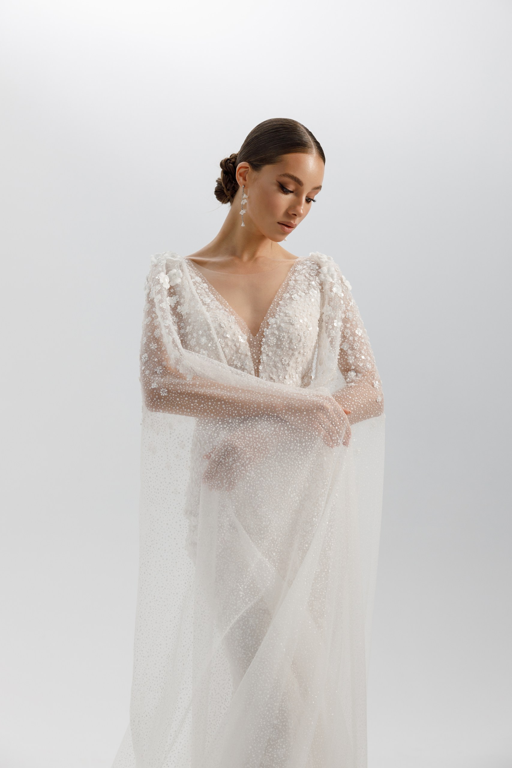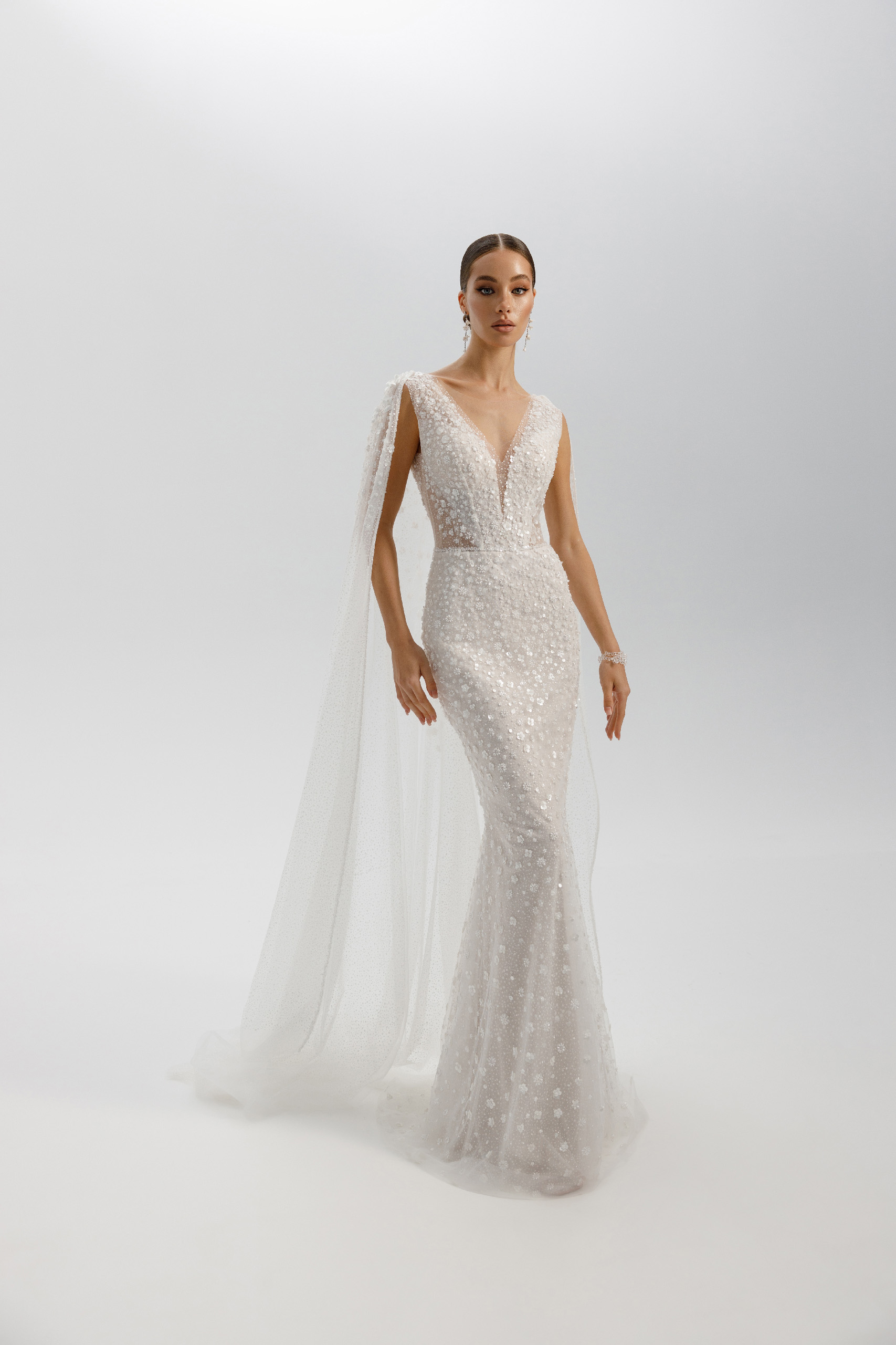 Premium. Силуэтное свадебное платье выполнено из необыкновенной красоты кружева усыпанного бисерными цветочками на слое фатина с глиттером «снег». Лиф на внутреннем корсете имеет акцентные приоткрытые бочка, что визуально делает талию тонкой. Комфортная юбка на трикотажной основе. Ульрамодный мерцающий кейп с 3д декором создает интригующий образ. Также платье удачно будет сочетаться со съемной юбкой Afrodita