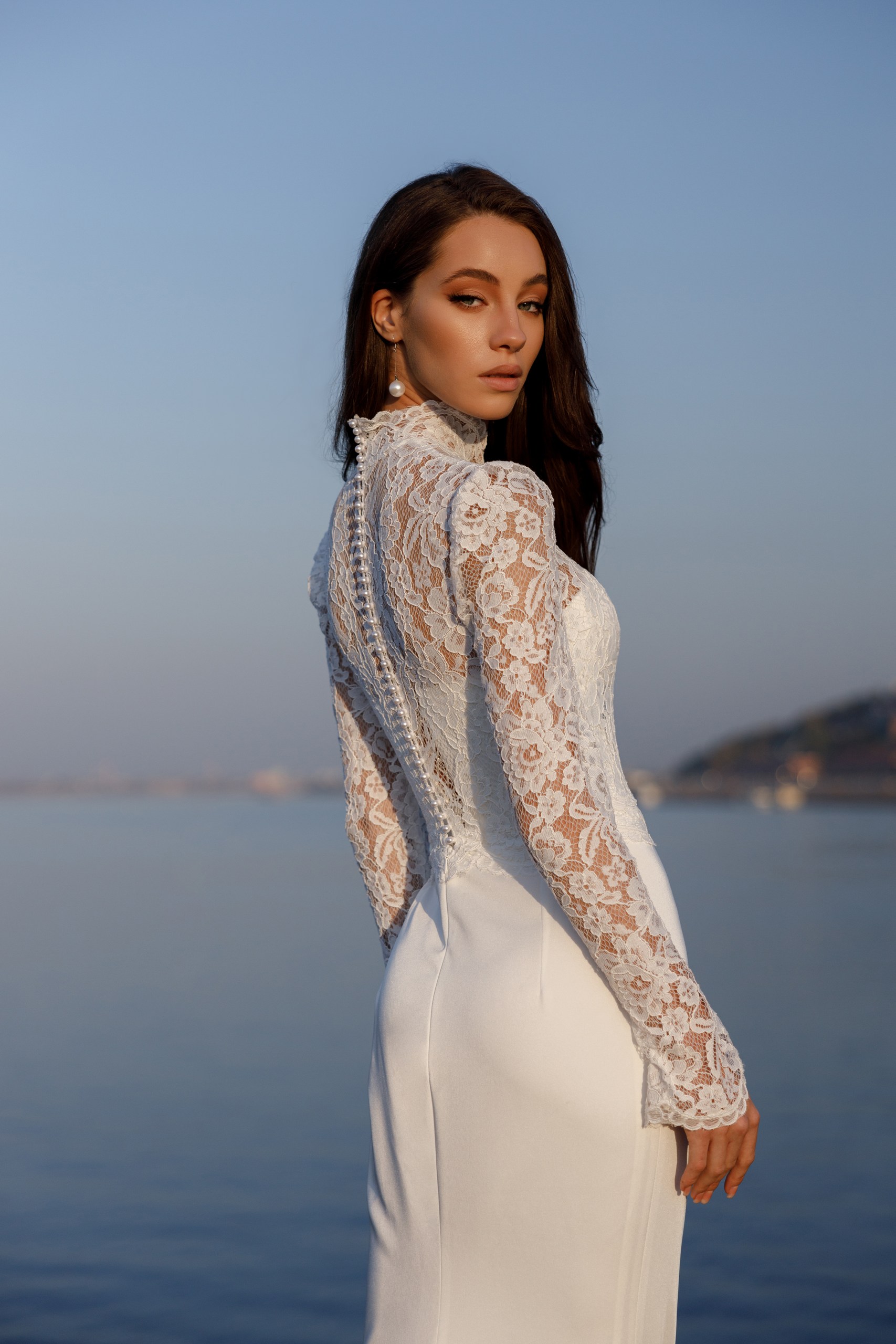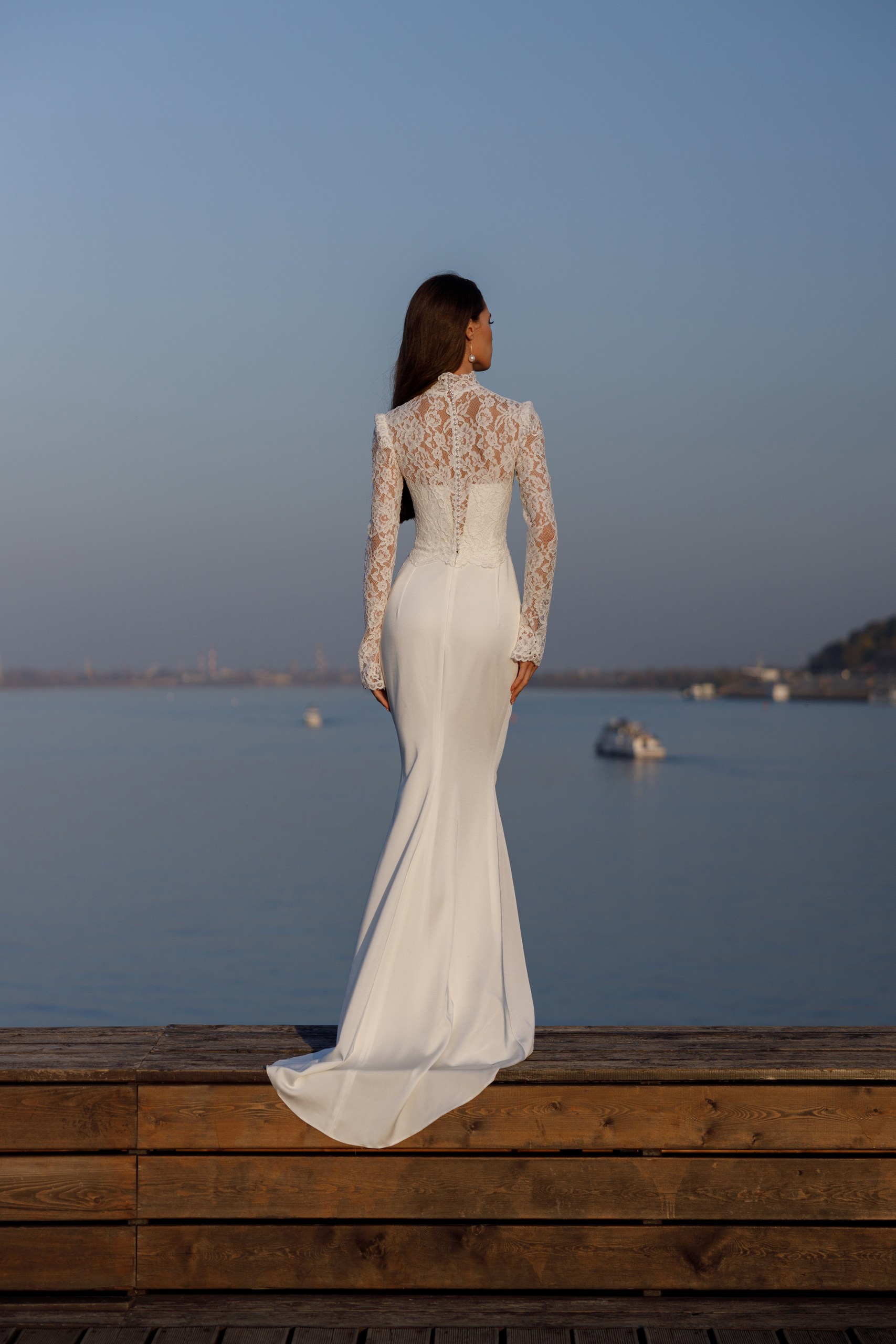 Аристократичное силуэтное платье с закрытым кружевным лифом и юбкой из итальянского стрейч атласа. Платье на атласном корсете. Юбка со складками по бедру и небольшим шлейфом. Образ дополняет атласная пышная юбка открытая спереди.