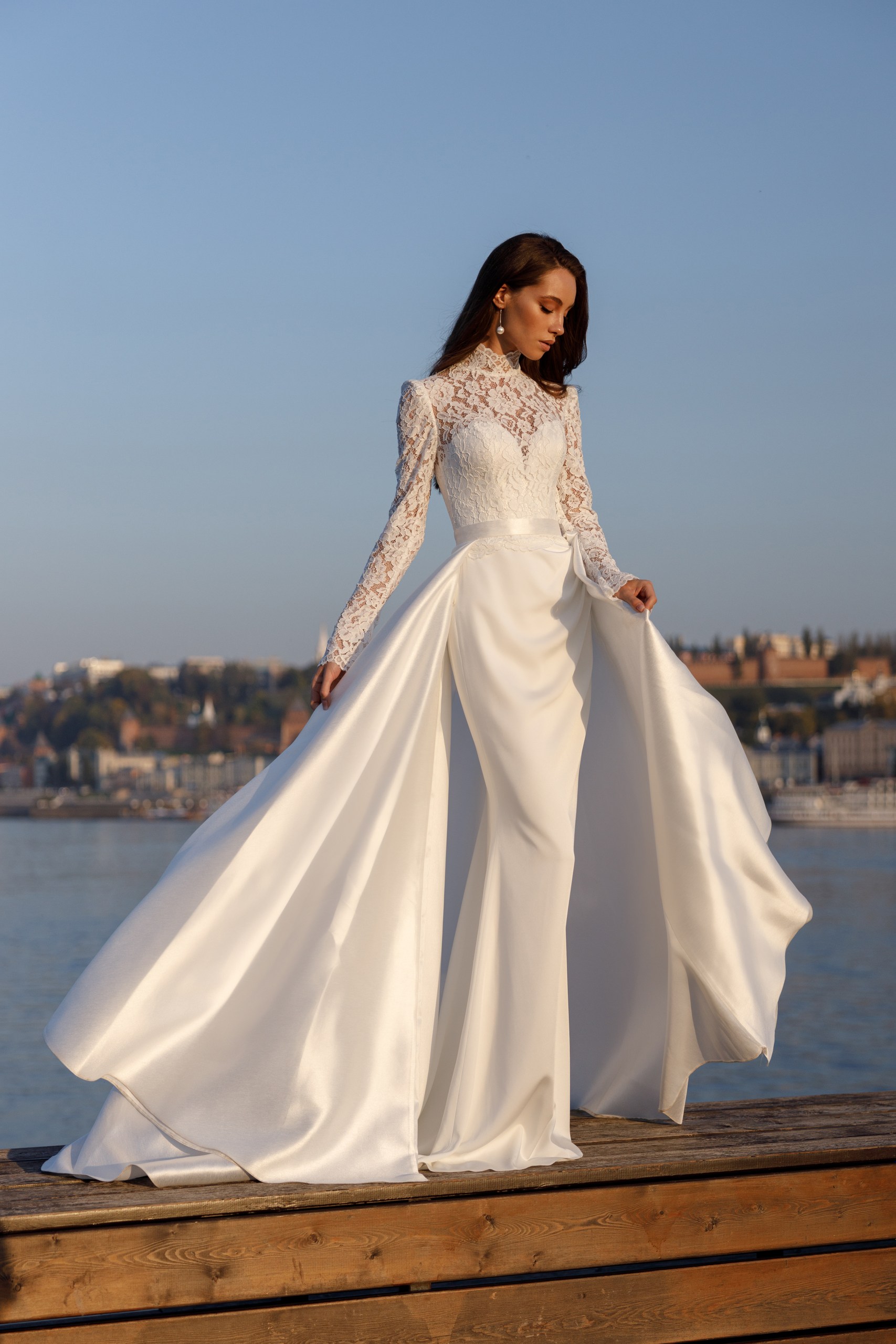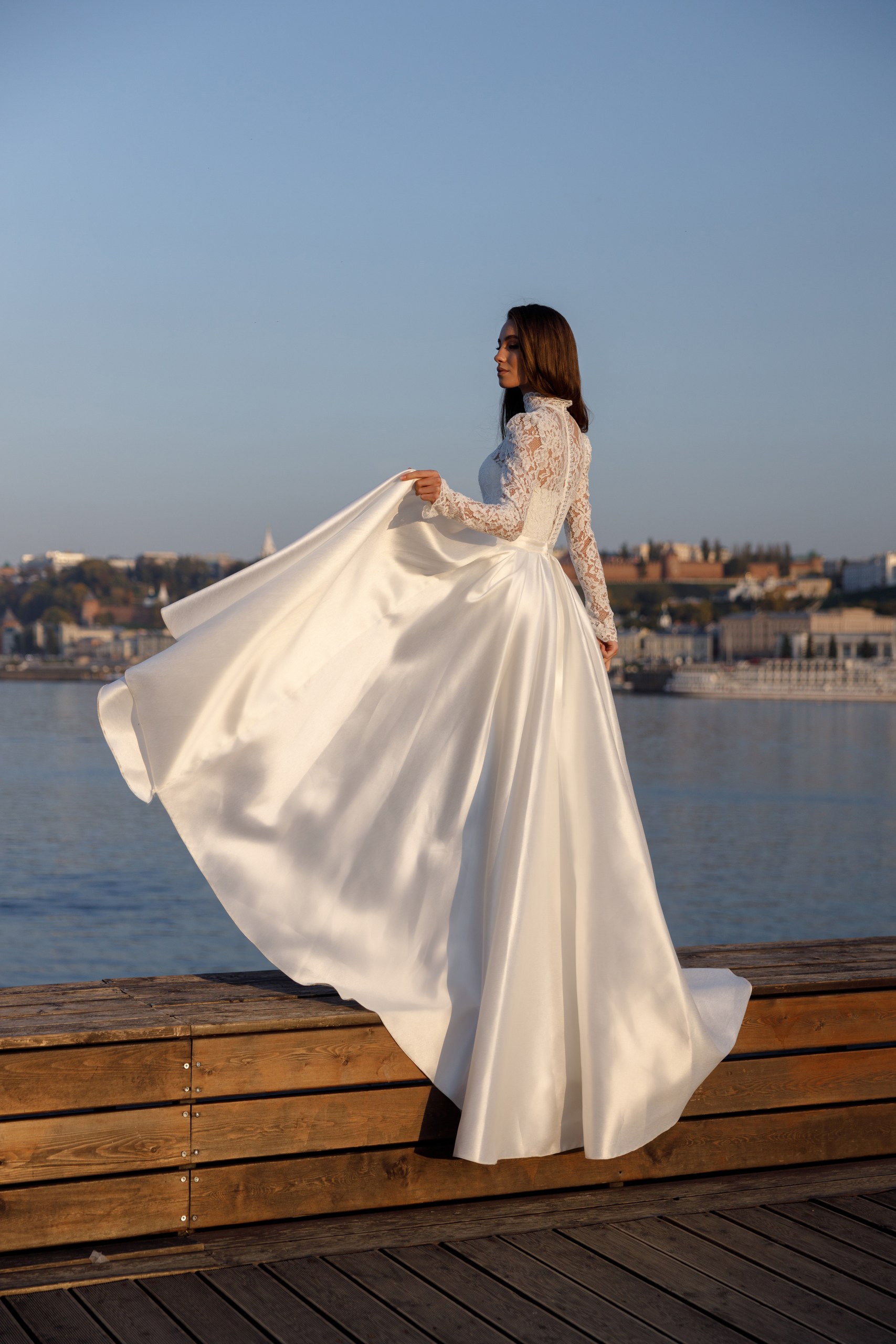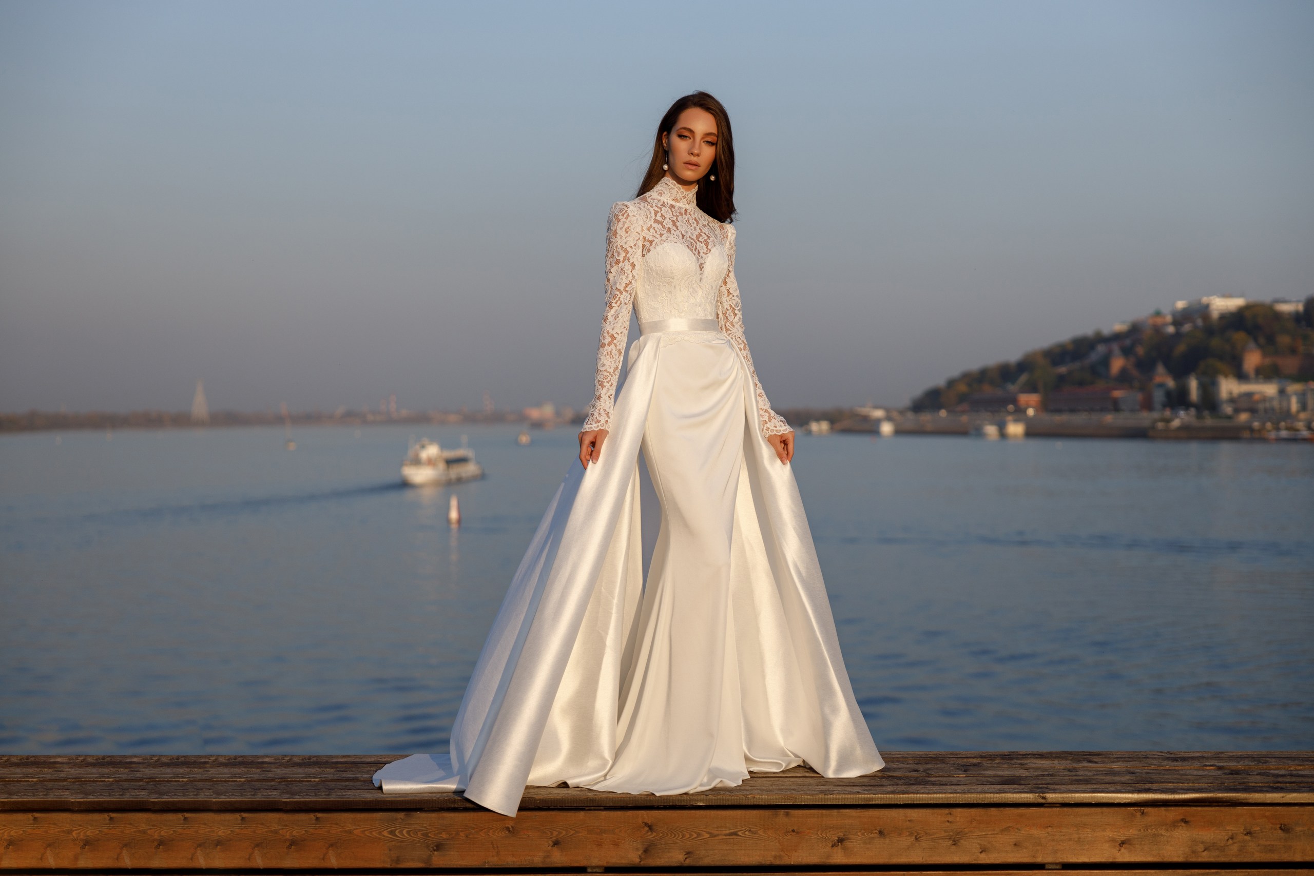 Аристократичное силуэтное платье с закрытым кружевным лифом и юбкой из итальянского стрейч атласа. Платье на атласном корсете. Юбка со складками по бедру и небольшим шлейфом. Образ дополняет атласная пышная юбка открытая спереди.