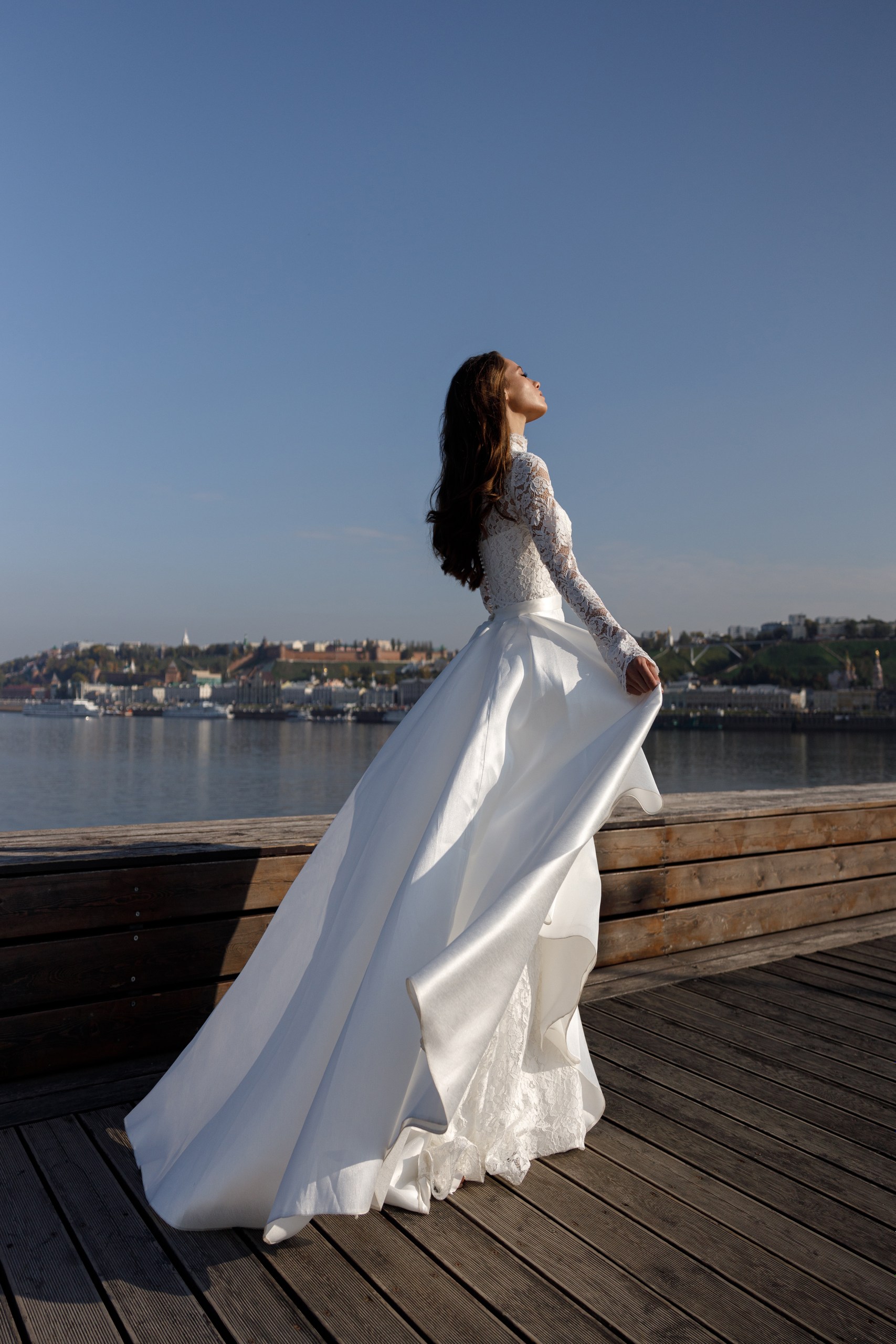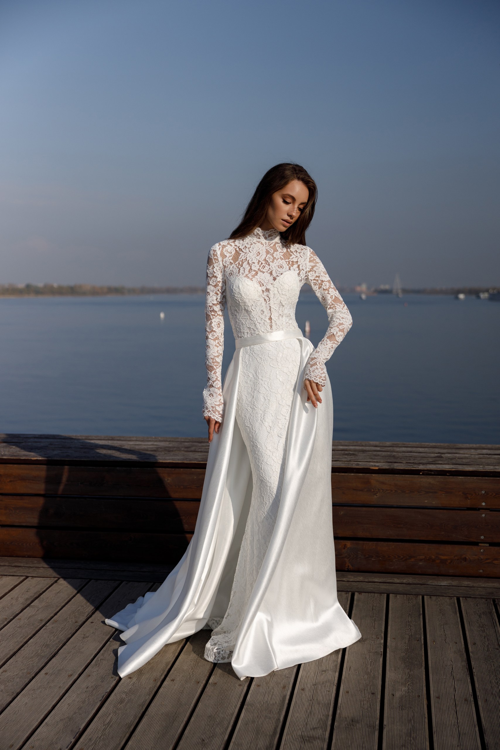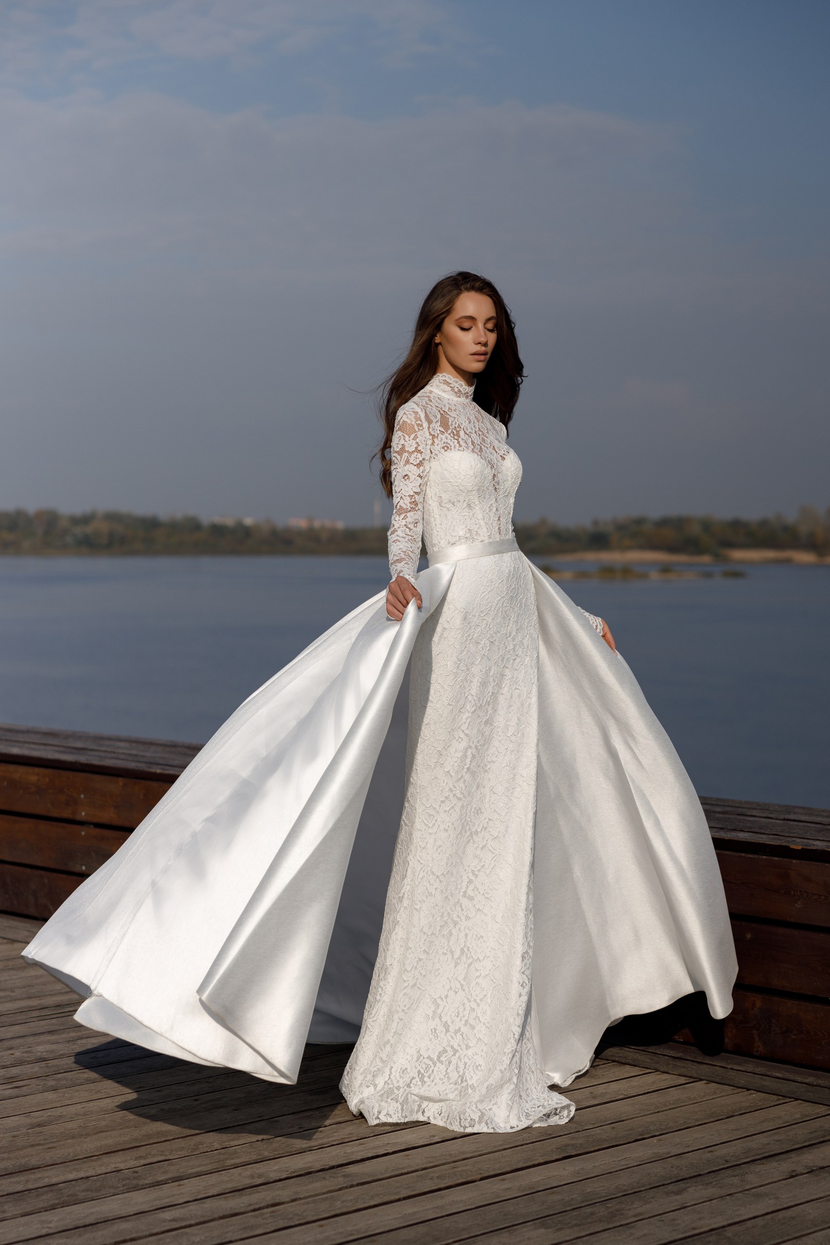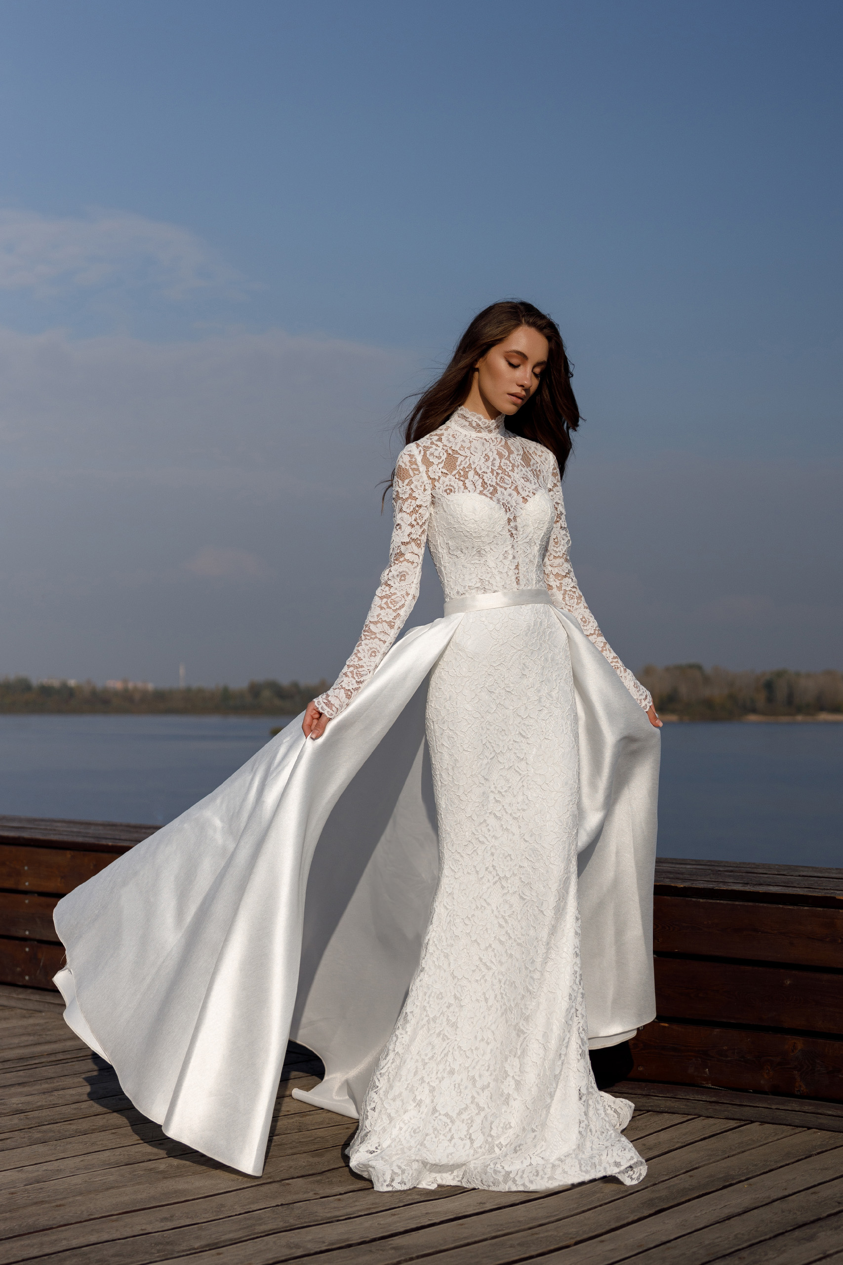 Нежная «рыбка» из кордового стрейч кружева. Закрытый топ на пуговках и воротником-стойкой, он может быть съемным, либо вшитым в платье. Комфортная юбка на трикотажной основе с втачным шлейфом. Образ дополнит съёмная юбка сo шлейфом из атласа.