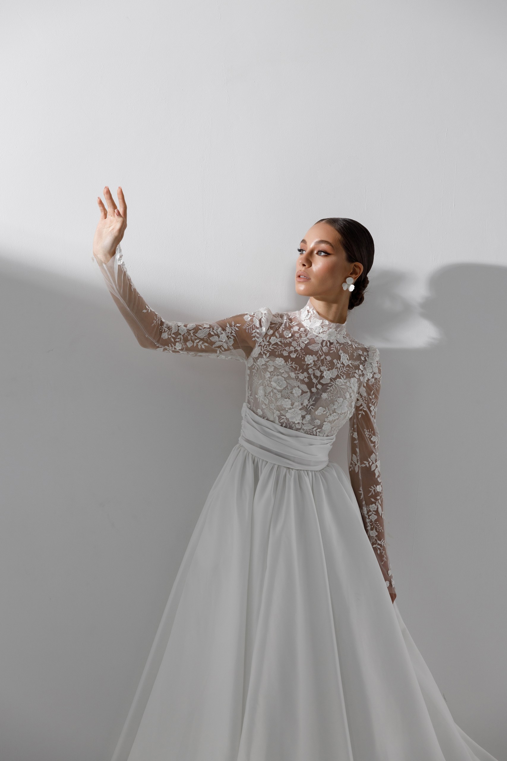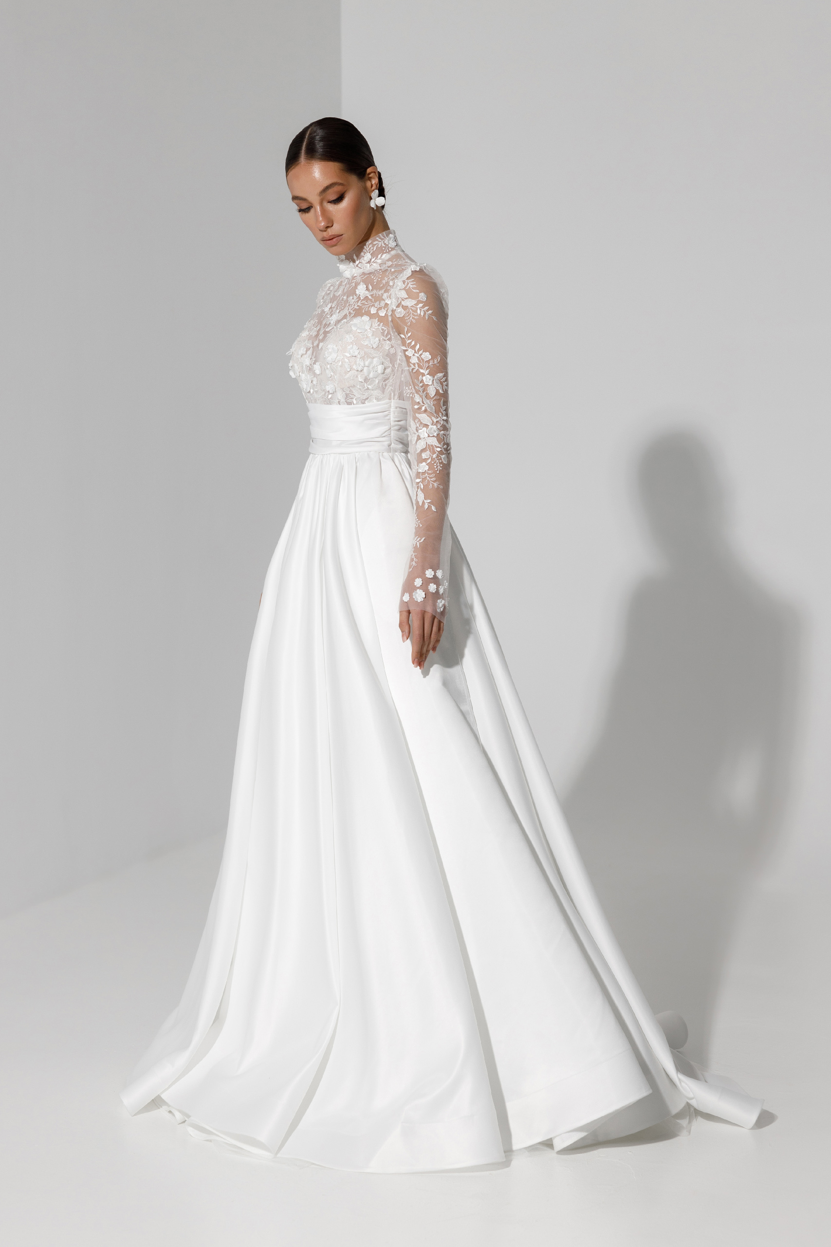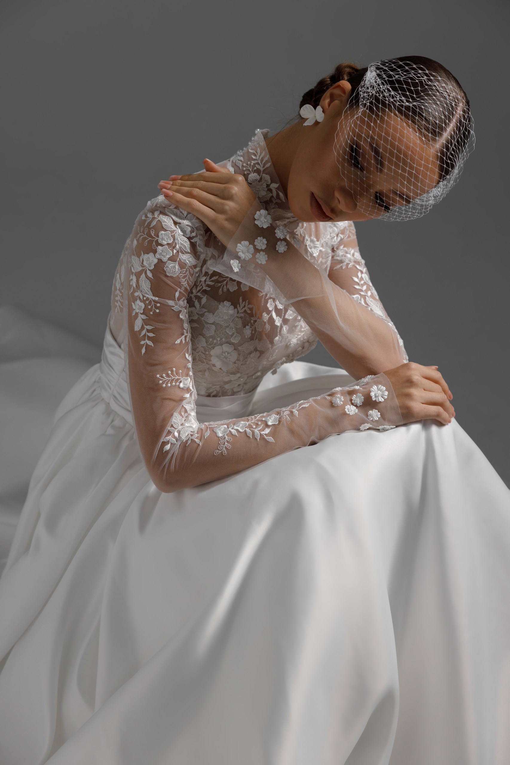 Торжественное платье с атласной юбкой и кружевным топом. Декорировано вручную россыпью цветочков по лифу и запястьям. Широкий атласный пояс акцентирует талию и удлиняет силуэт.