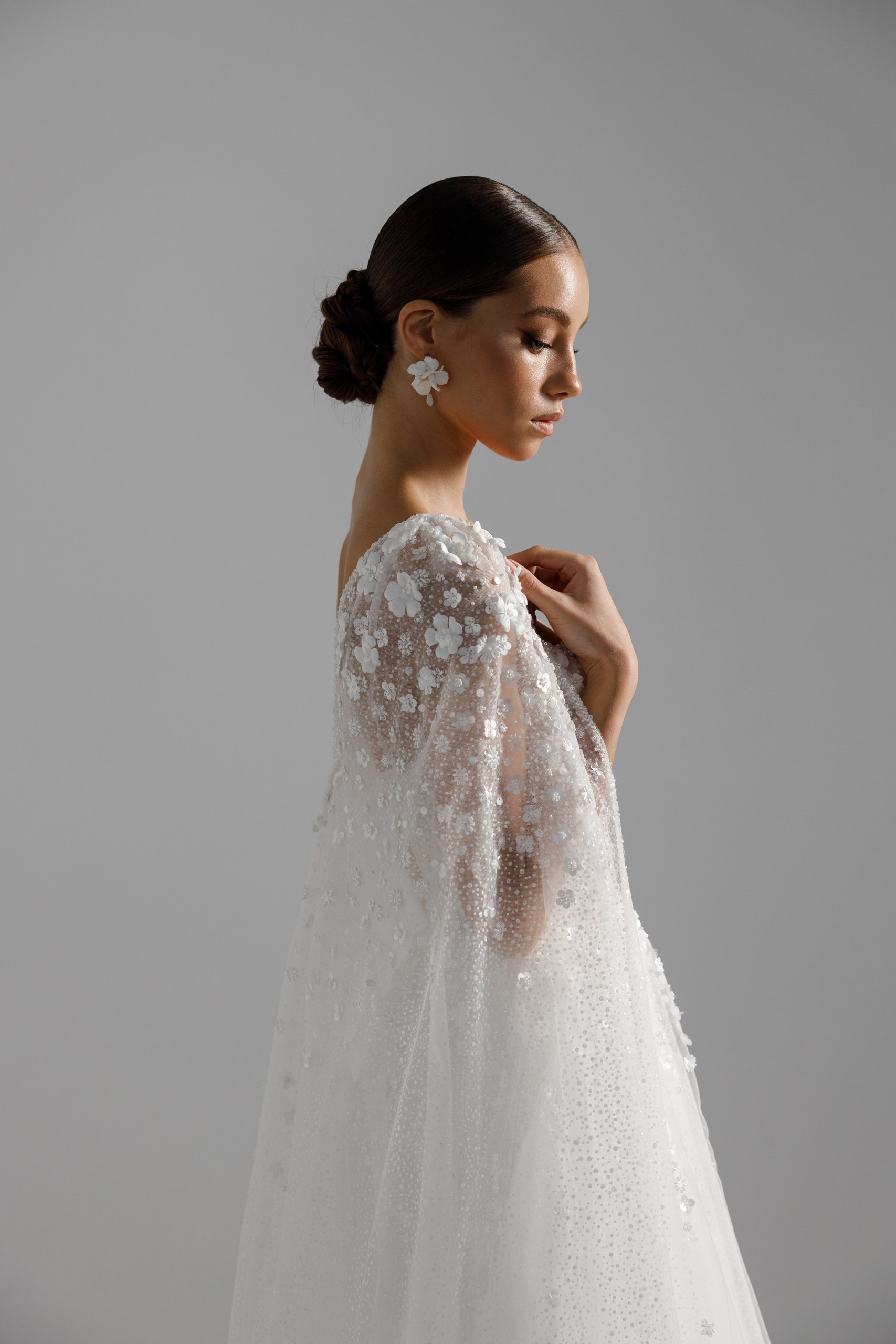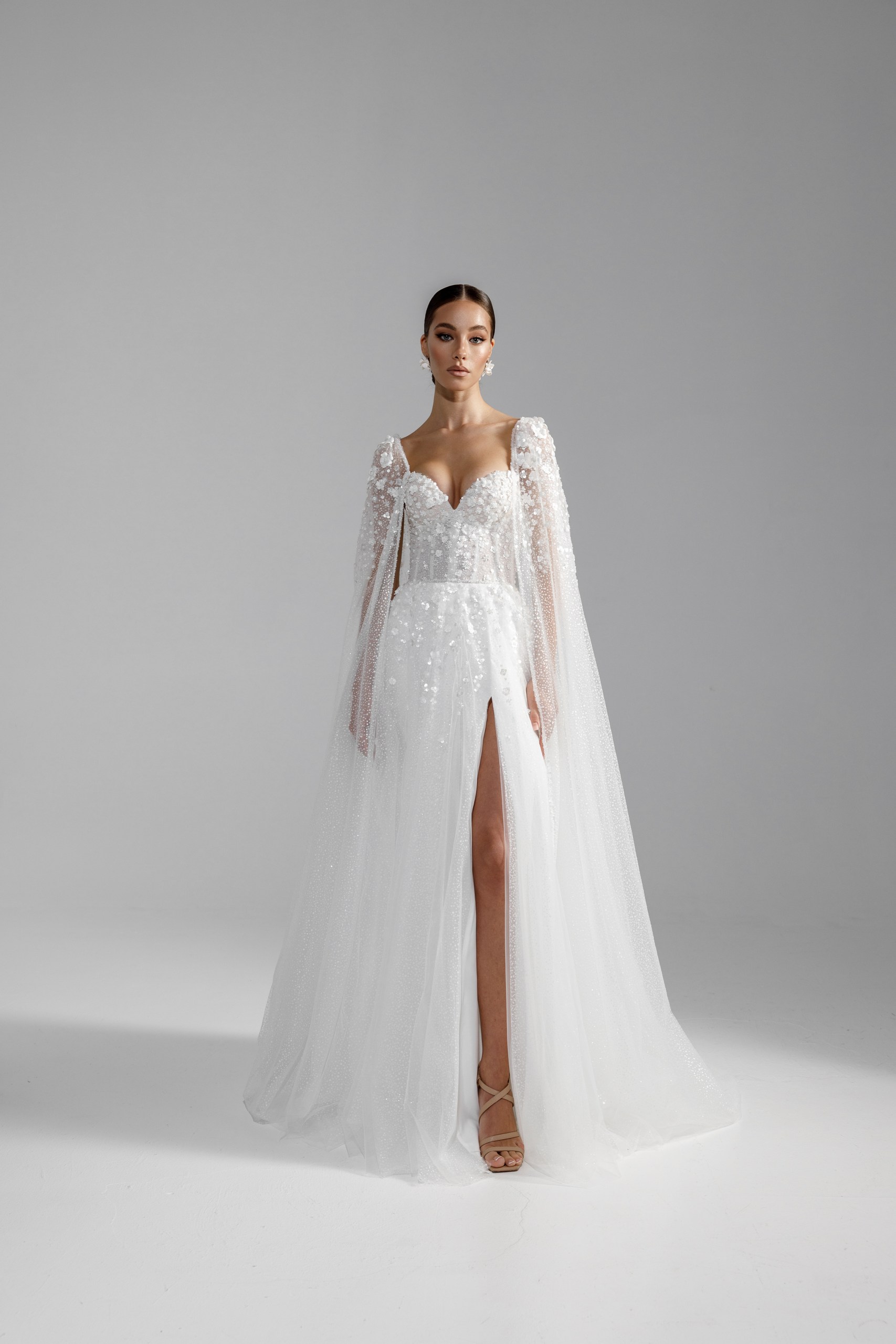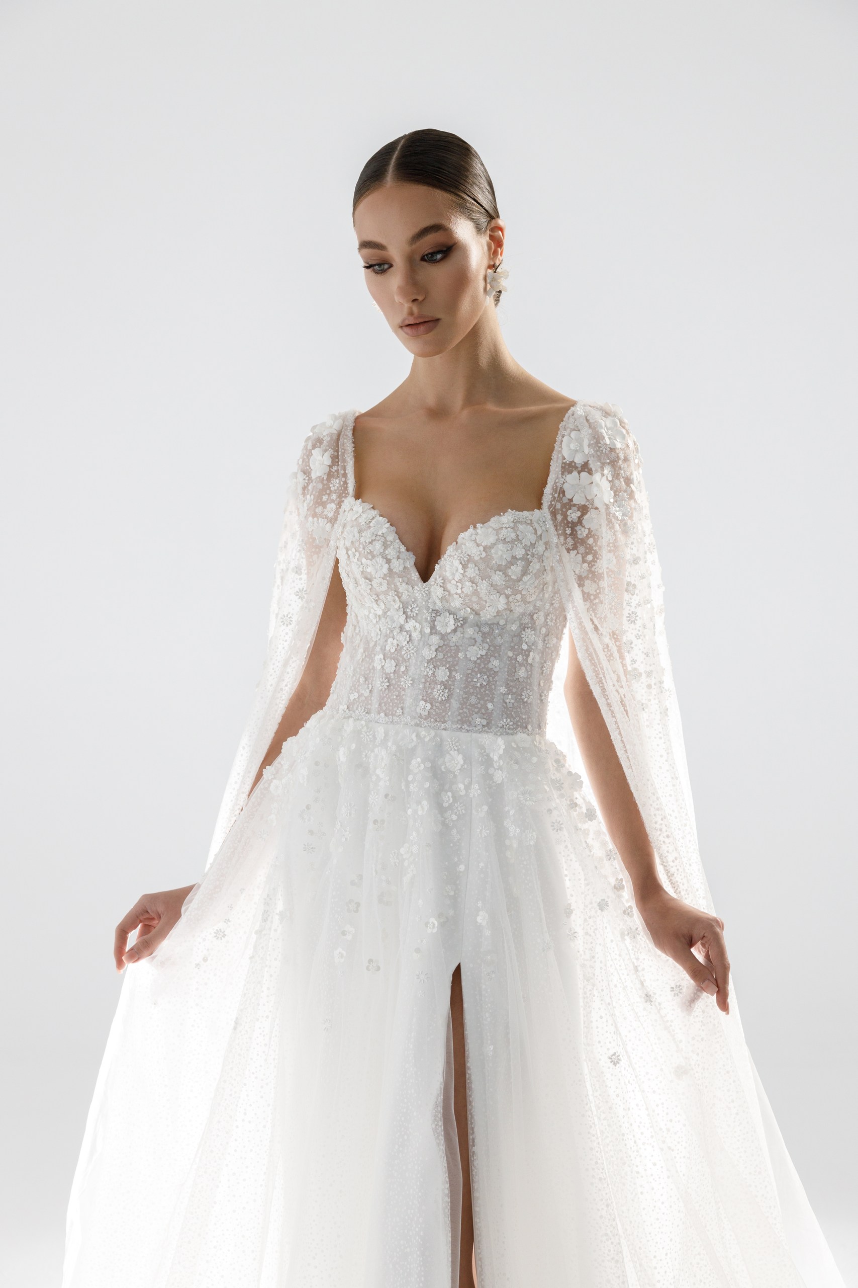 Premium. Яркое и нежное платье-трансформер со множеством аксессуаров, кардинально меняющих образ невесты. Корсет и юбка расшиты вручную кружевом из 3д цветочками из бисера, пайеток и атласа. Юбка с разрезом по левой ножке из фатина и глиттера «снег».