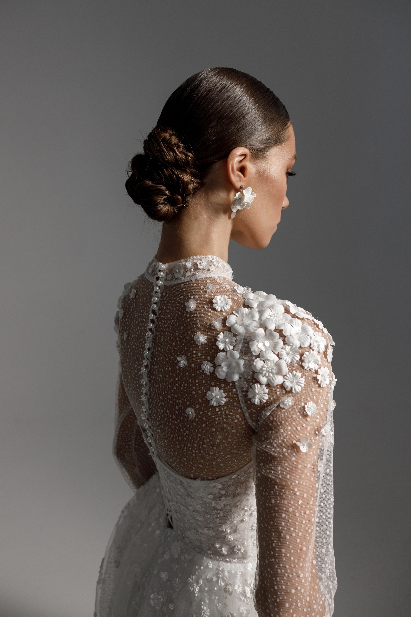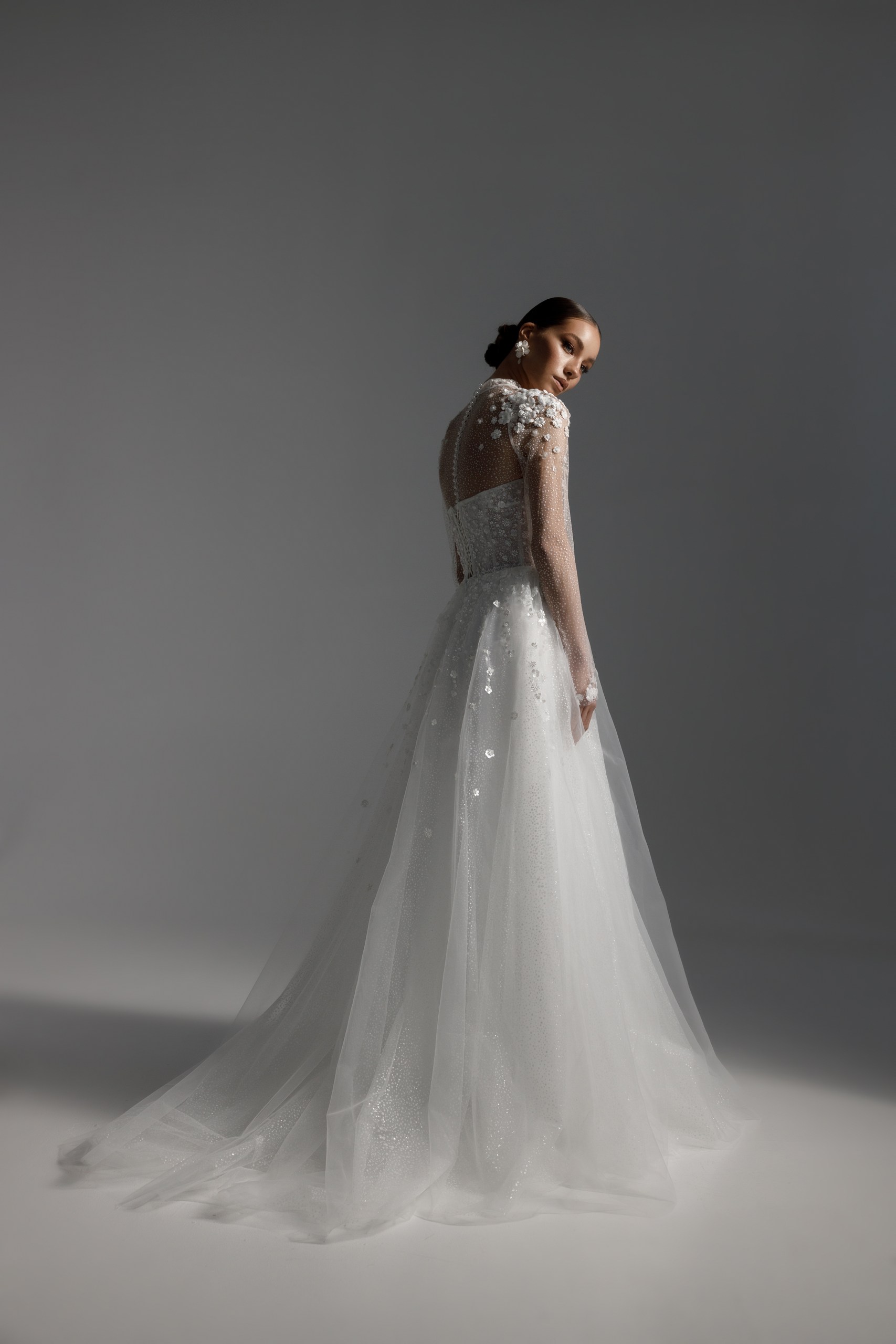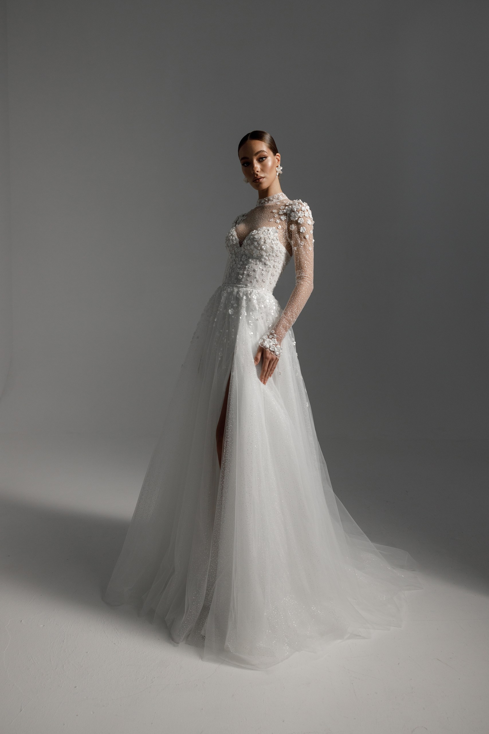 Premium. Яркое и нежное платье-трансформер со множеством аксессуаров, кардинально меняющих образ невесты. Корсет и юбка расшиты вручную кружевом из 3д цветочками из бисера, пайеток и атласа. Юбка с разрезом по левой ножке из фатина и глиттера «снег».