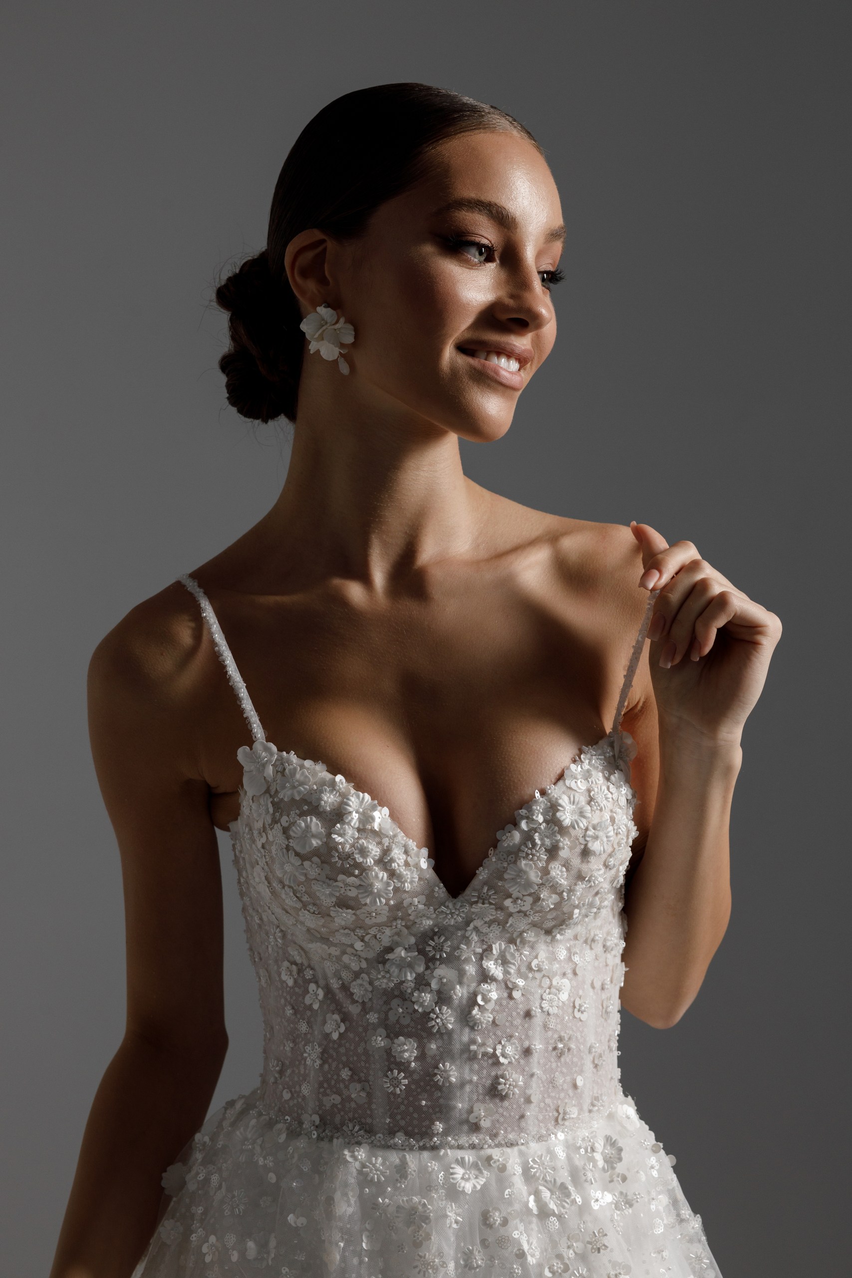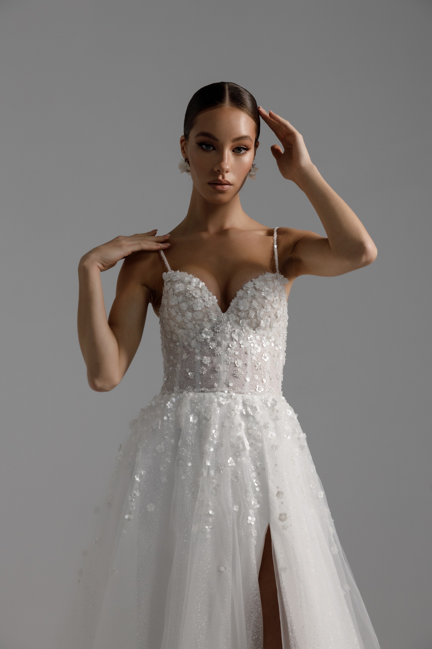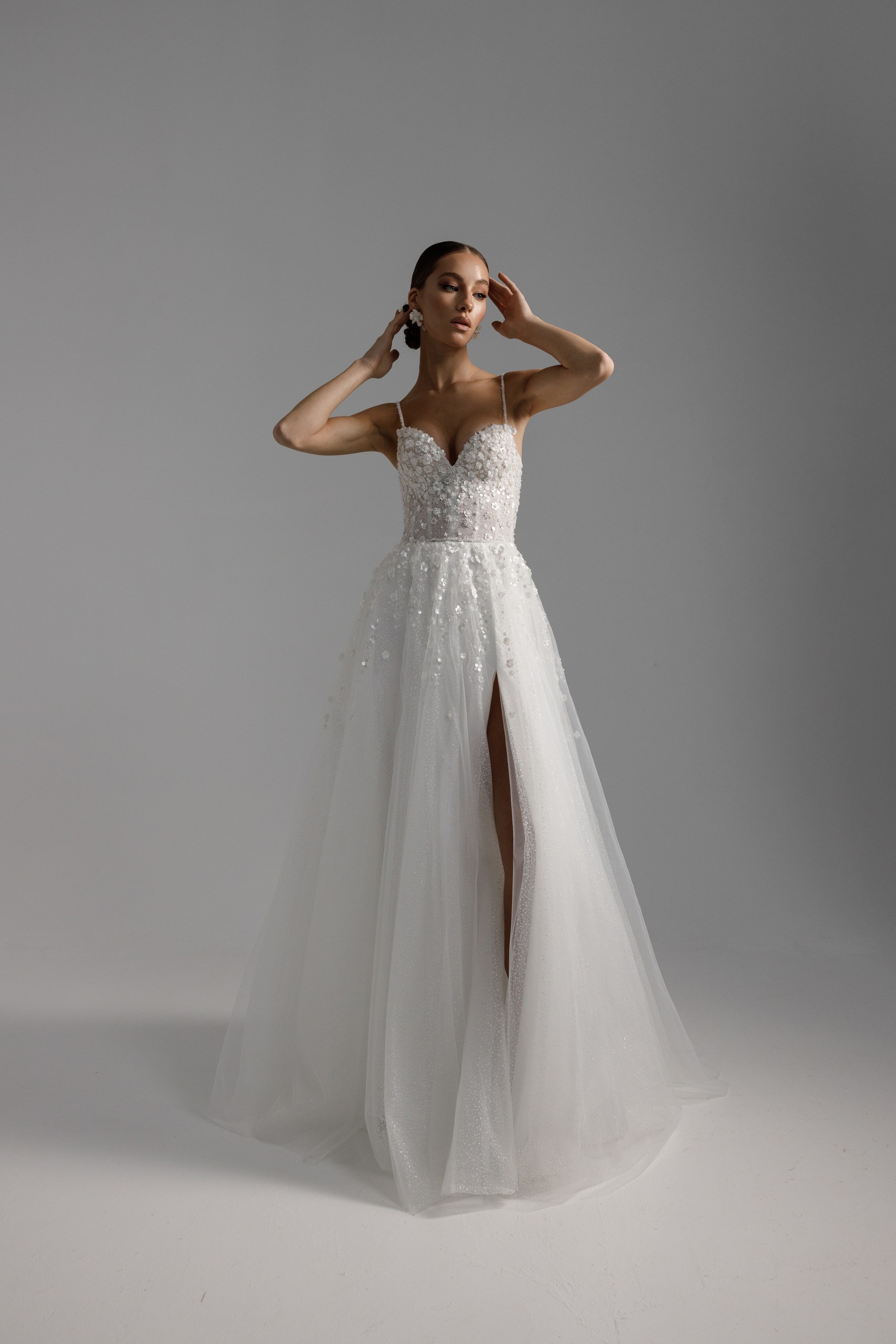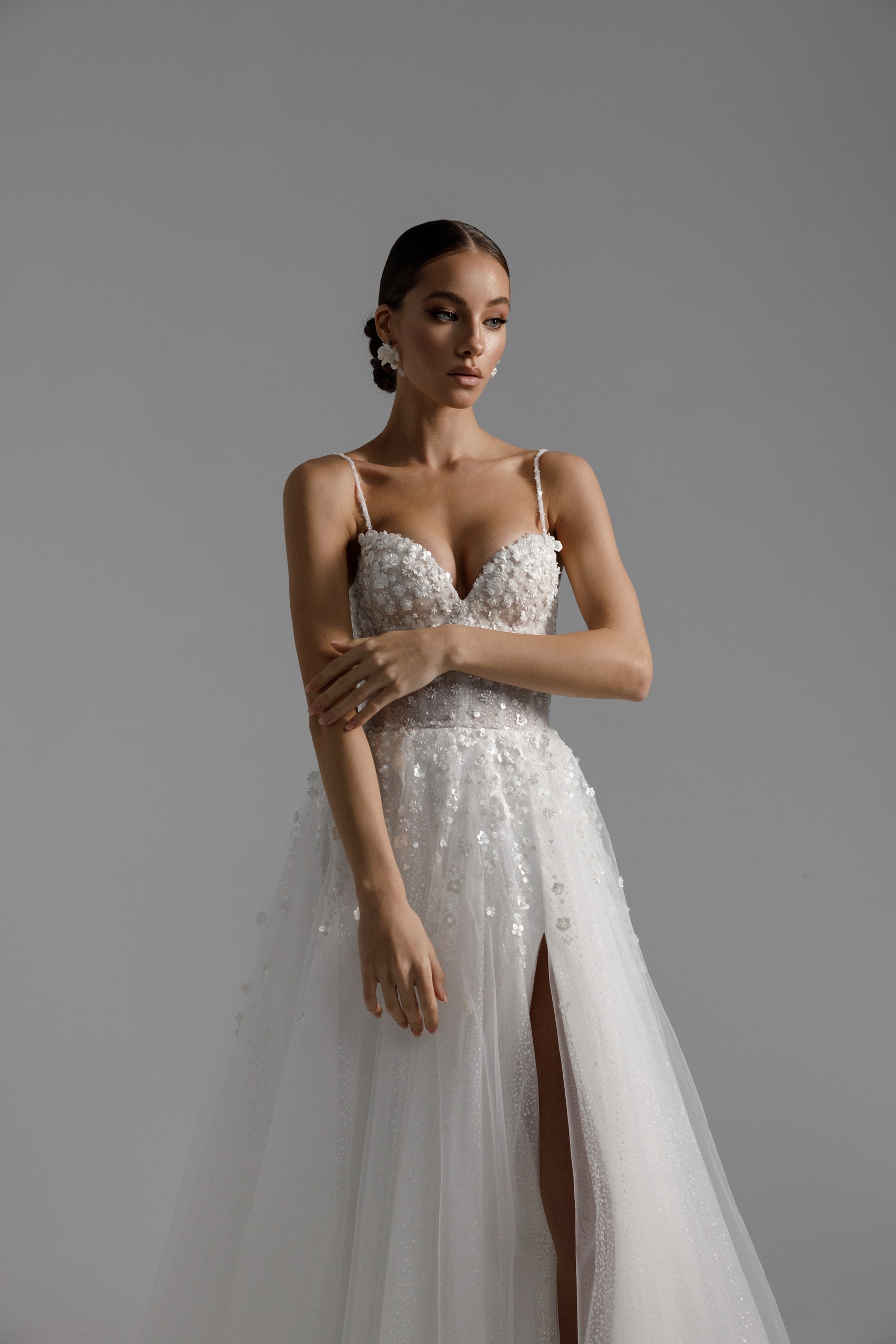 Premium. Яркое и нежное платье-трансформер со множеством аксессуаров, кардинально меняющих образ невесты. Корсет и юбка расшиты вручную кружевом из 3д цветочками из бисера, пайеток и атласа. Юбка с разрезом по левой ножке из фатина и глиттера «снег».