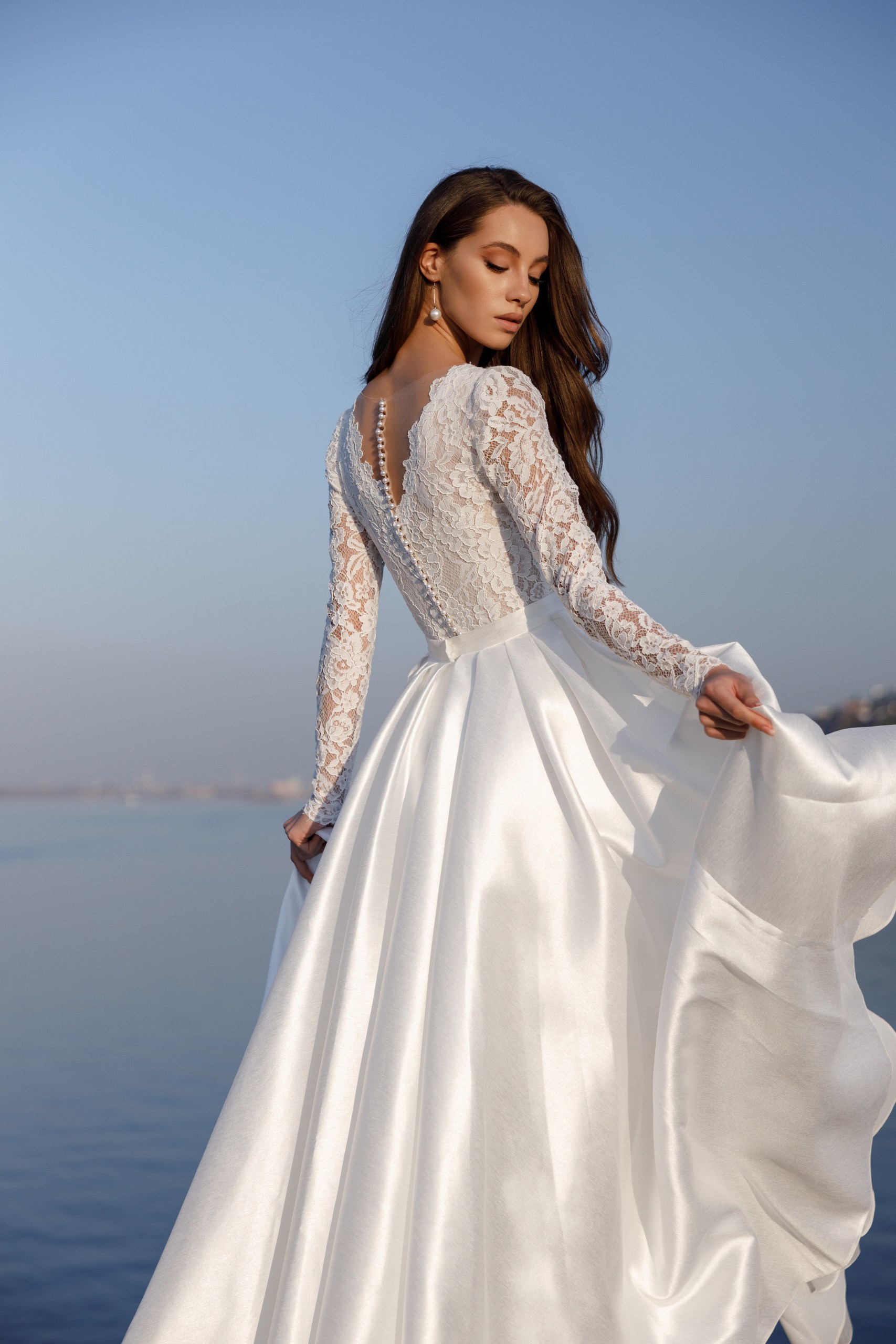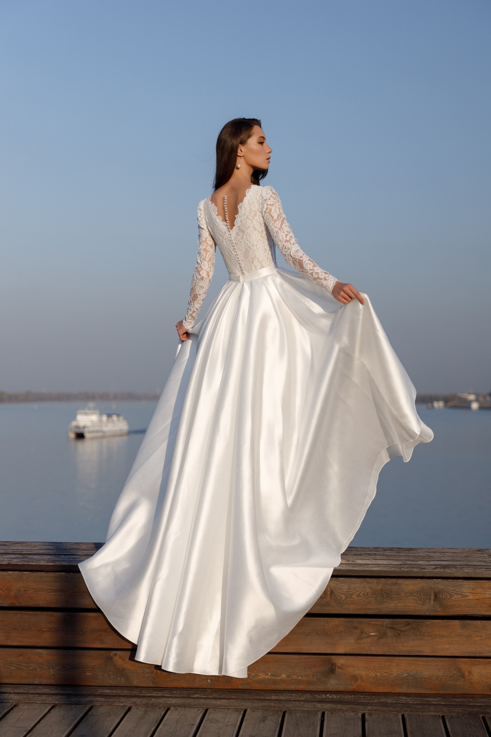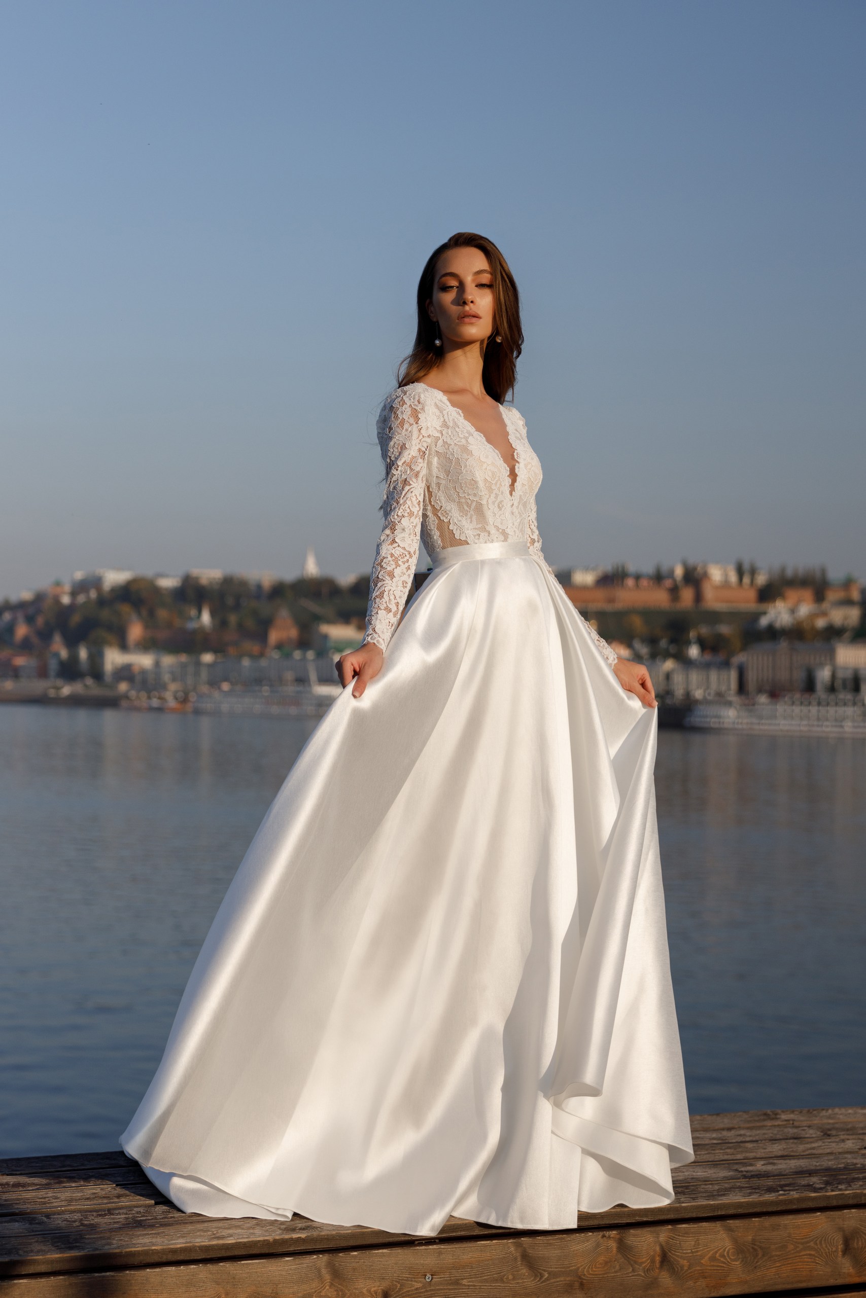 Свадебное платье с атласной юбкой. Кружевной лиф на внутреннем корсете и полупрозрачными бочками. Спинка топа на жемчужных пуговках. Юбка со складками у талии.