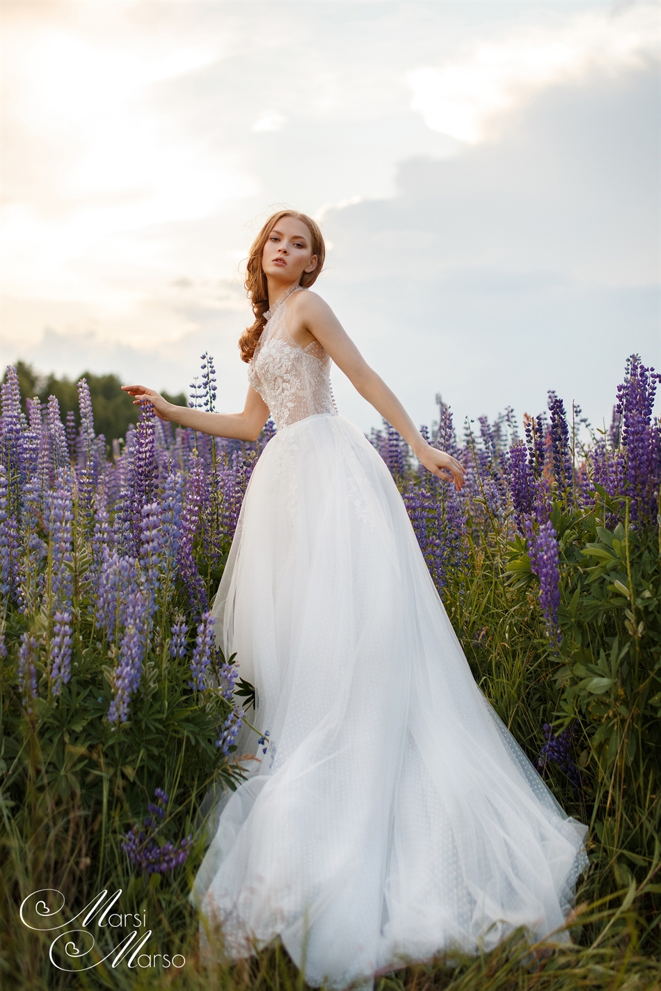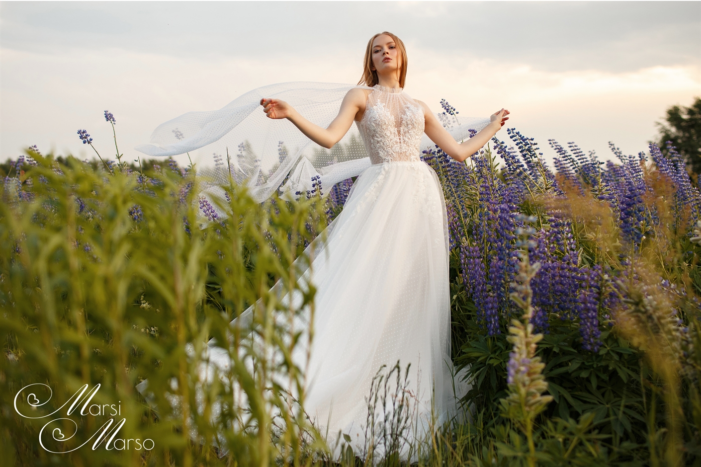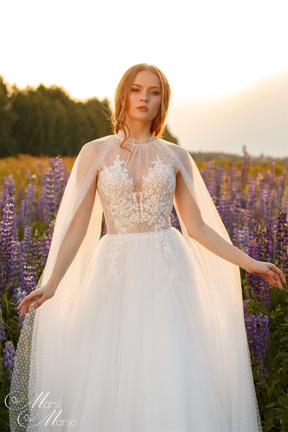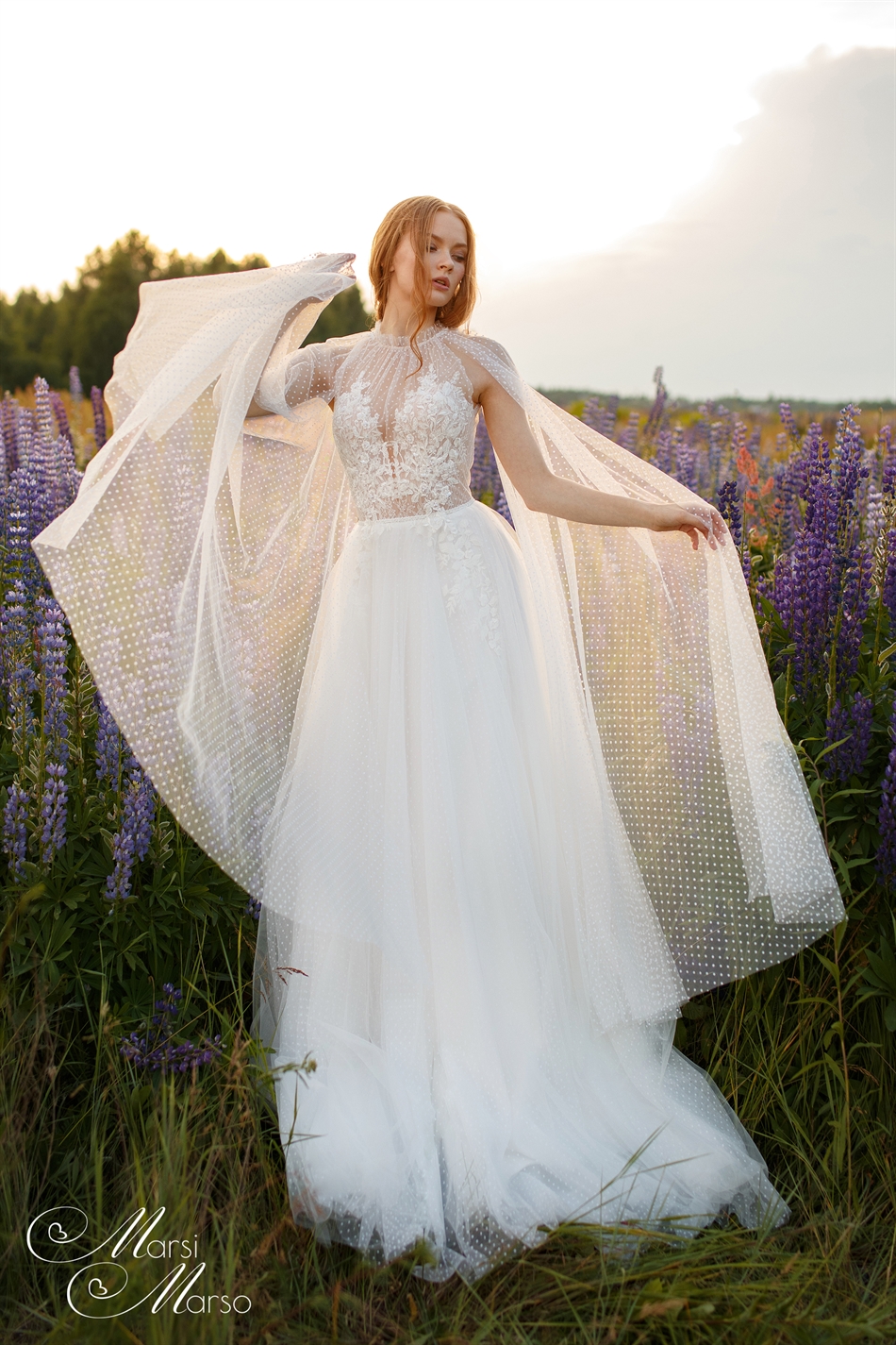 Идеально легкий образ! Деликатная отделка, изящное расшитое кружево, модный и кокетливый горошек — все слагаемые счастья, которое спешит к своей избраннице на воздушных крыльях кейпа романтичного платья Amalia.