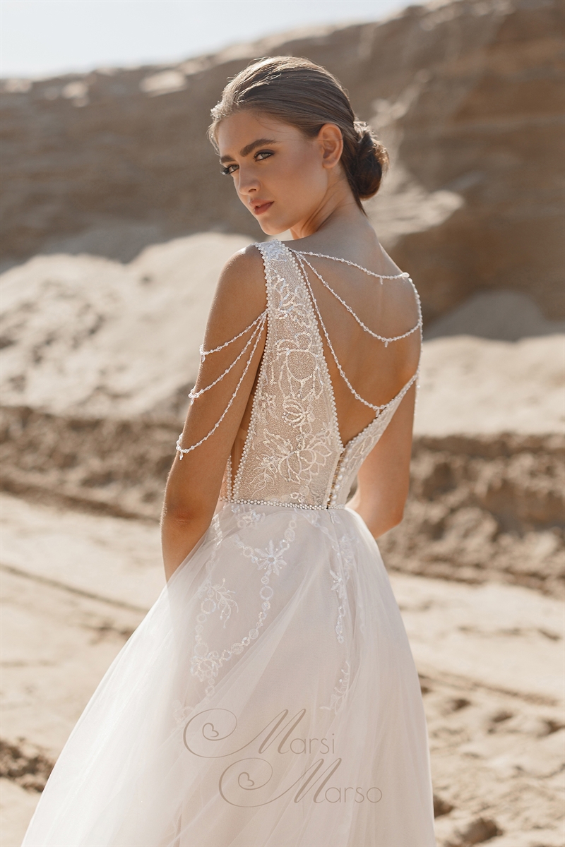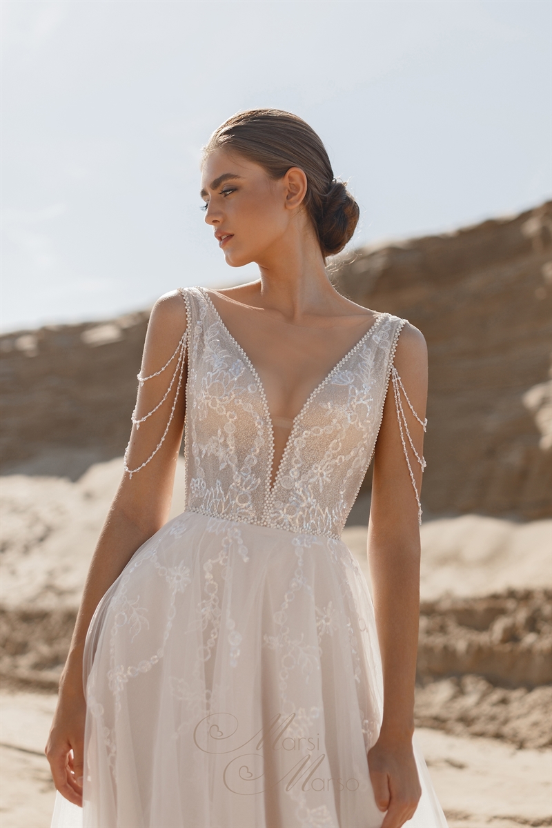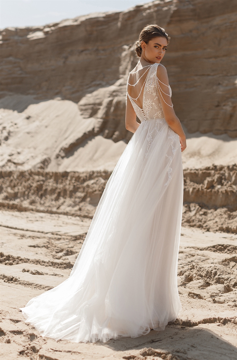 Идея сверкающего свадебного наряда ворвалась в моду, как яркая комета — не все успели адаптироваться и принять, но все под впечатлением! Даже сторонницы минимализма готовы рискнуть, и есть ради чего - деликатно мерцающая ткань слегка подсвечивает лицо и создает поистине сияющий образ! Съемные бусики по плечам и спинке - яркие акценты и завершающий штрих мегапопулярного Beyonce.