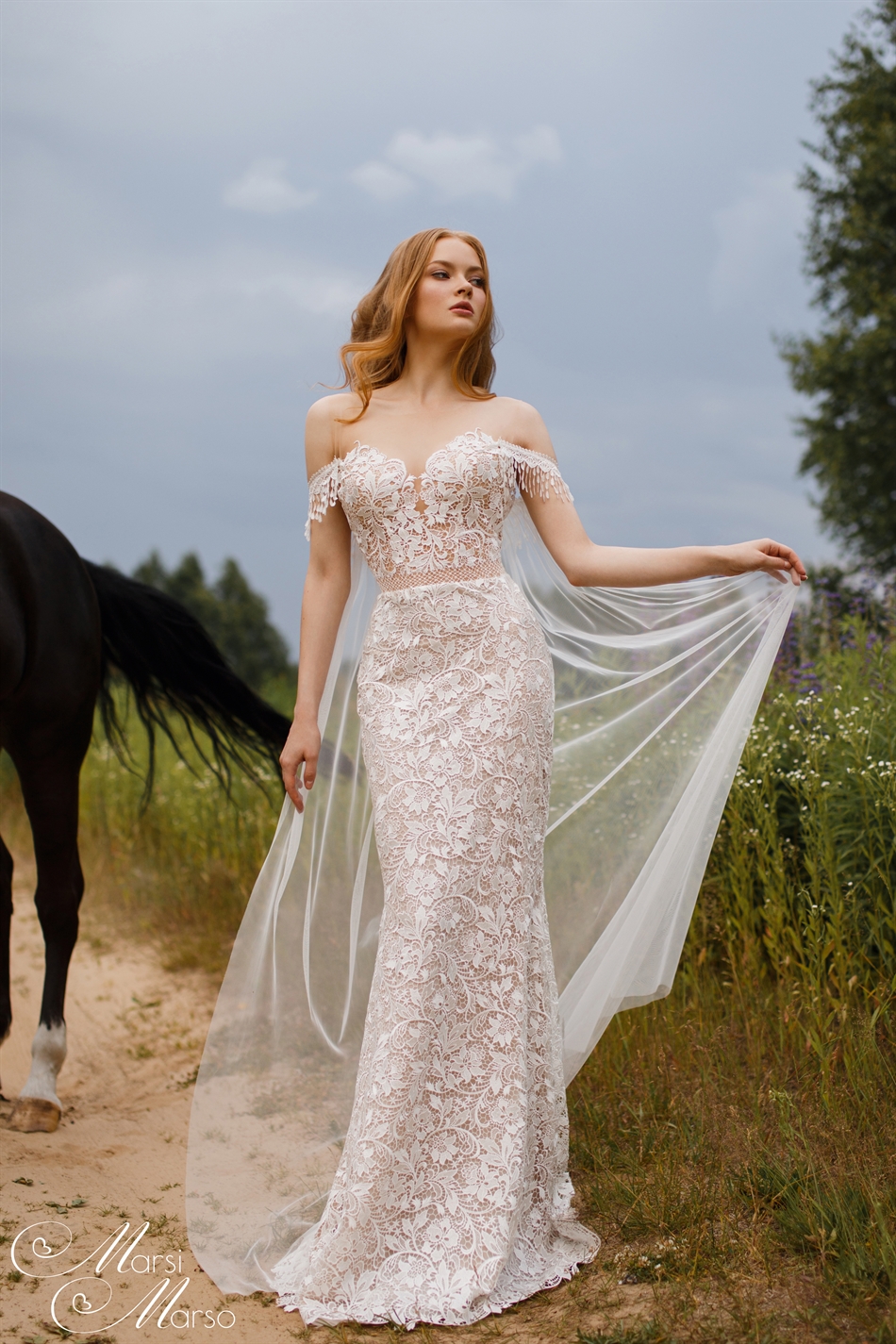 Denise с кейпом — смелый и актуальный вариант. Обнаженная спинка и акценты бохо образуют волнующий ансамбль, сотканный из чувственной нежности и очарования.